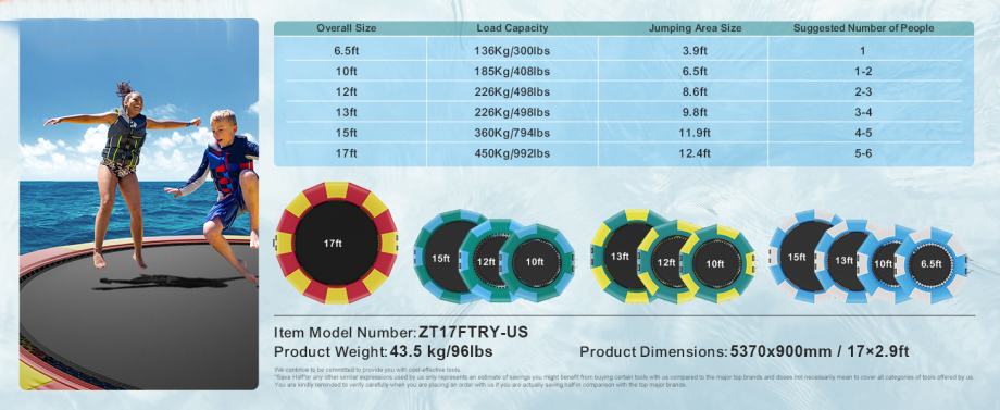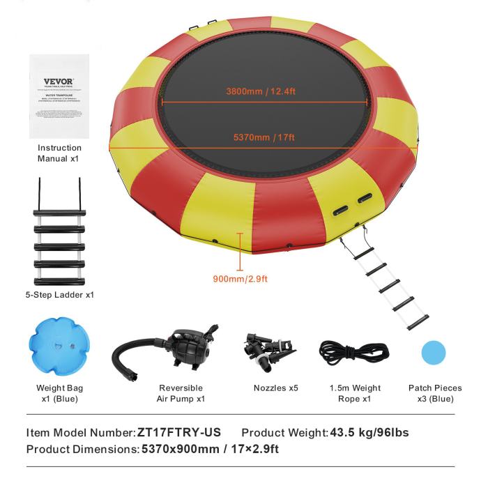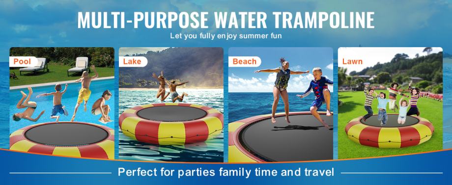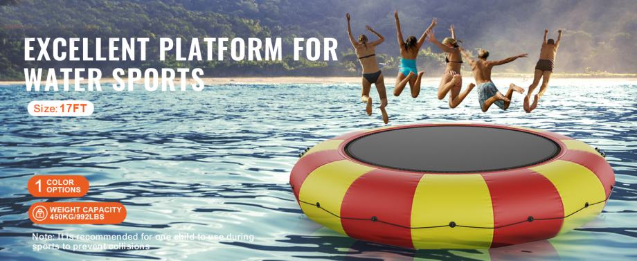 Možete uživati u ljetnoj zabavi na 5 metara velikoj površini za odskakanje. Vodeni trampolin na napuhavanje pruža izvrsnu elastičnost za vaše vodene aktivnosti bez opružnih bungee užeta i isprepletenih najlonskih jastučića. S maksimalnom nosivošću od 450 kg, može zabavljati 5-6 djece odjednom. Vodeni trampolin izvrsna je platforma za vodene sportove.