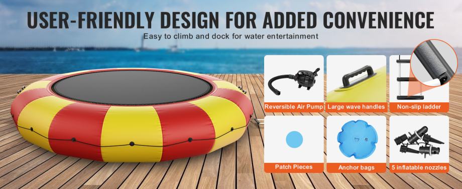 Dizajn prilagođen korisniku: velike valovite ručke pružaju udoban zahvat i izvrsno trenje. Dodavanje naljepnica upozorenja potiče pravilnu upotrebu proizvoda, produžujući njegov vijek trajanja. Povećana površina ljestava osigurava udobno i sigurno penjanje, omogućujući vam da se s lakoćom opustite ili sunčate na trampolinu. Plutajući trampolin može se postaviti na bilo koju vodenu površinu, kao što su jezera, more, bazeni itd., samo budite oprezni i izbjegavajte oštre predmete.