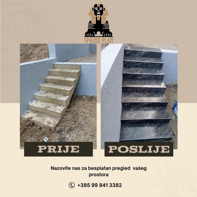 Ugradnja podnih i zidnih pločica svih vrsta (kupatila, kuhinje, terase, stepeništa), fugovanje i završna obrada.