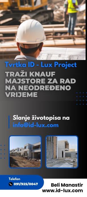 Knauf majstor odgovoran je za izvođenje suhomontažnih radova, prvenstveno postavljanje Knauf (gips-kartonskih) ploča na zidove, stropove i pregradne konstrukcije prema tehničkoj dokumentaciji. Rad uključuje pripremu podloge, montažu metalnih profila, obradu spojeva, izolaciju i završne radove.