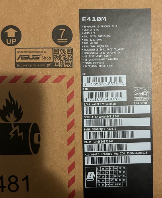 Prodajem Notebook Asus 14, E410MA-EK1281WS, 14" FHD, Intel Celeron N4020 up to 2.8GHz, 4GB DDR4, 128GB eMMC, Intel UHD Graphics 600, Win 11 S…