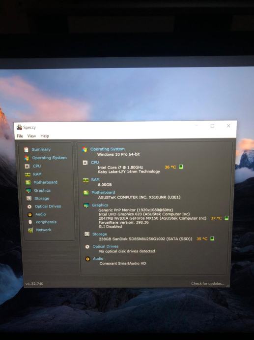 - Laptop ima dvije grafičke kartice, integriranu Intel HDU i zasebnu NVIDIA GeForce MX150 2GB DDR5