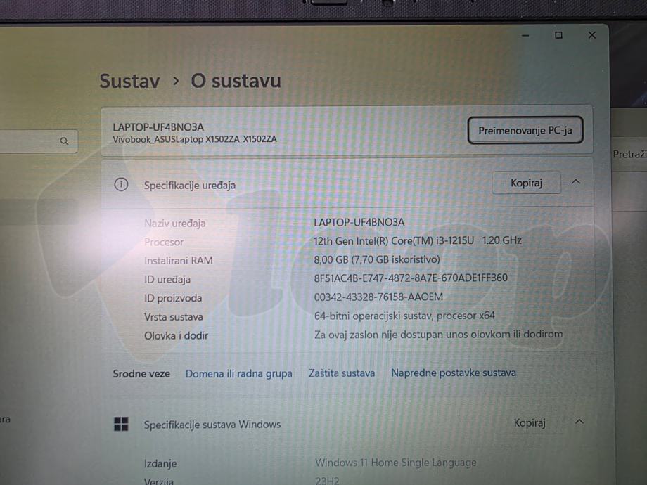 odlično očuvan laptop ASUS Vivobook 15, model X1502ZA-EJ003W, s pismenom garancijom do 25.08.2025. godine.