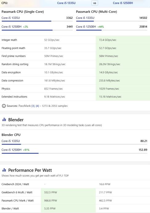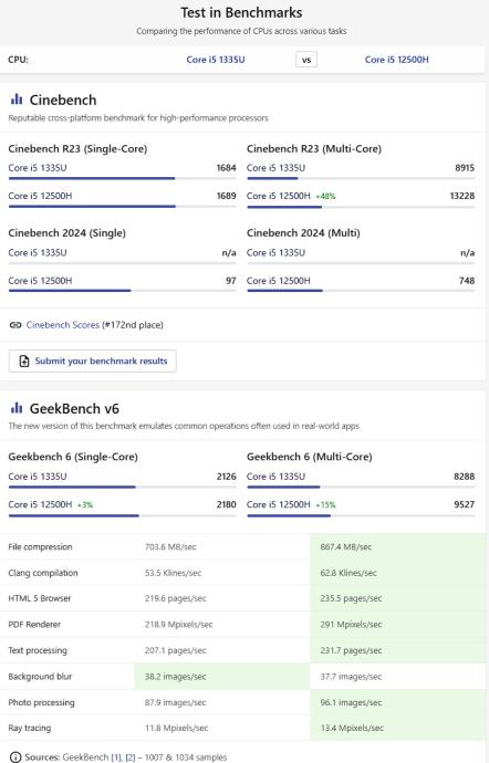 - slike rezultata najčešćih benchmarka te usporedba s i5 1335u koji je najbliži cjenovnom rangu.