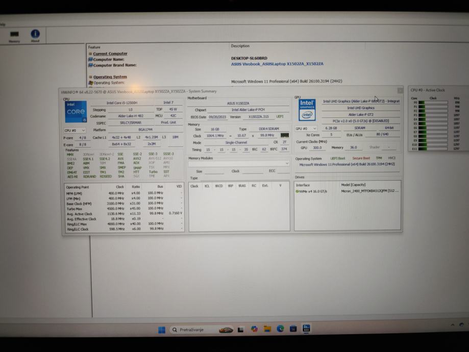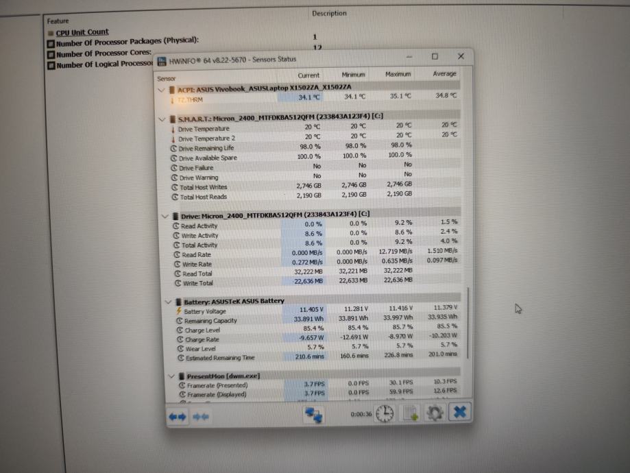 - slike iz programa HW INFO s prikazom tehničkih karakteristika i općenito stanja baterije i ssd diska.
