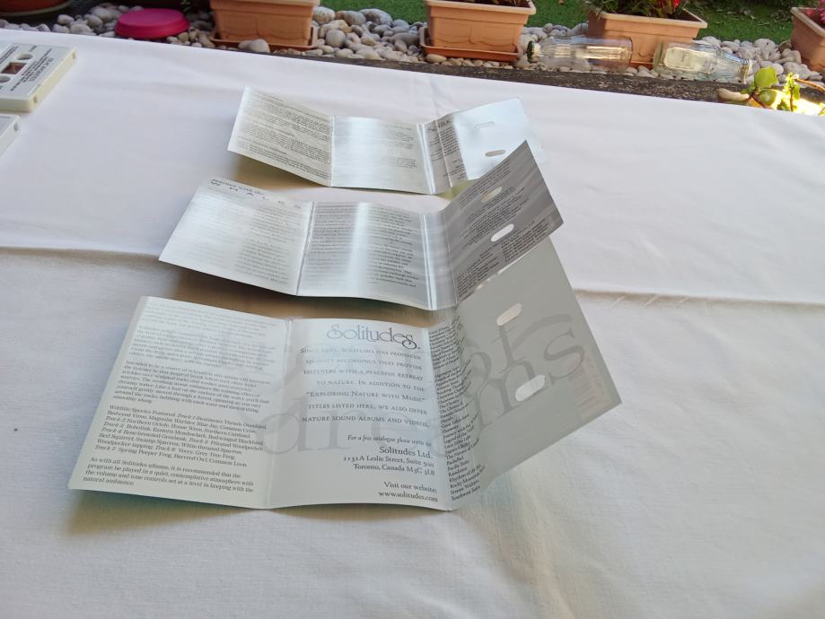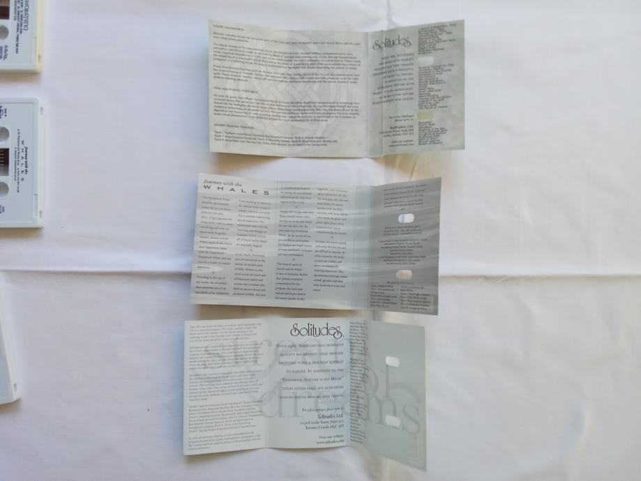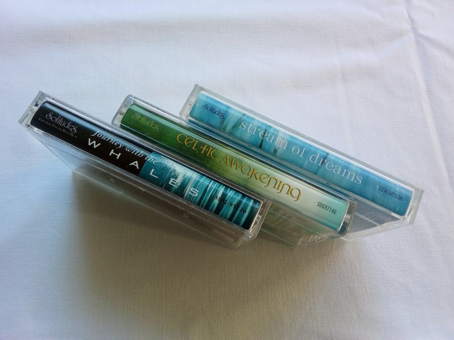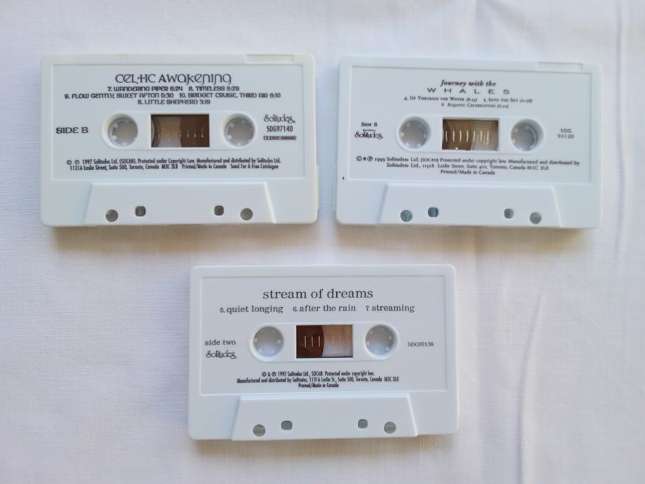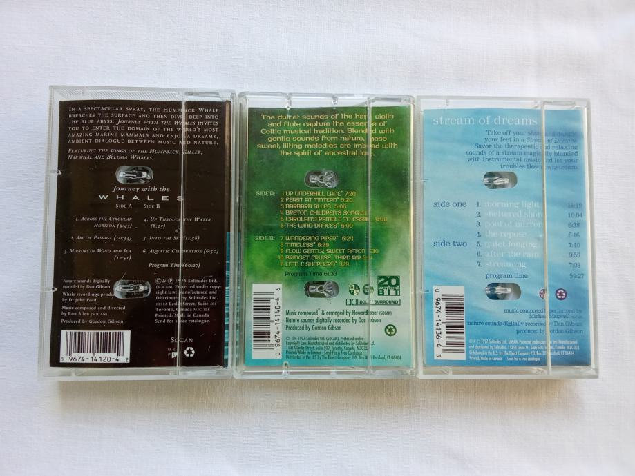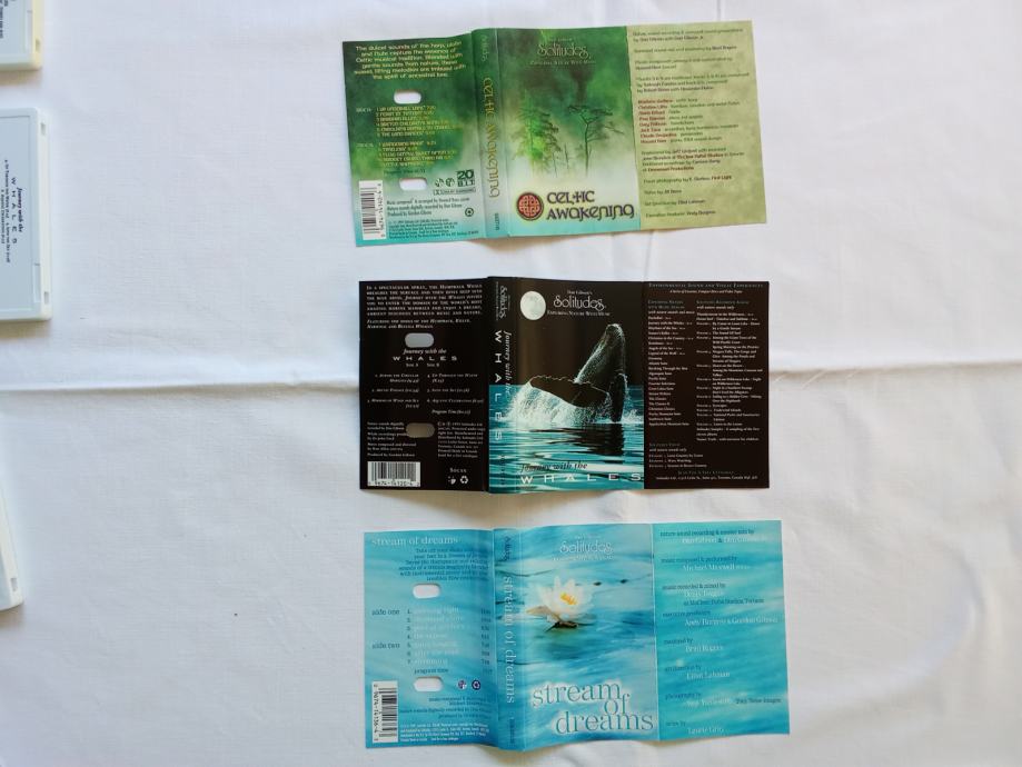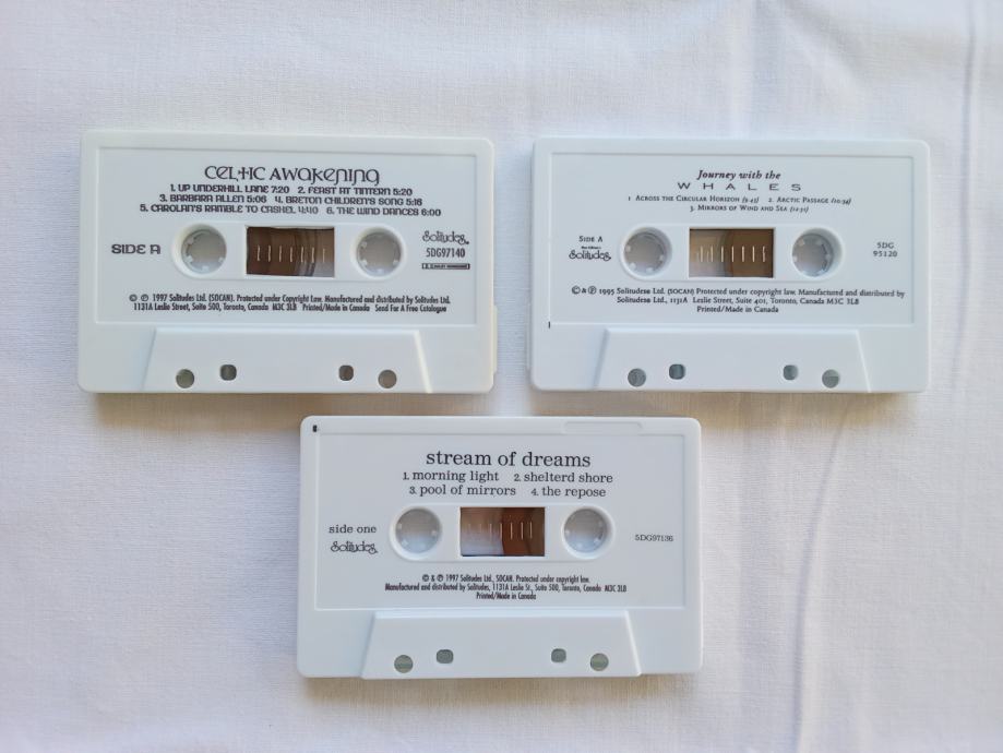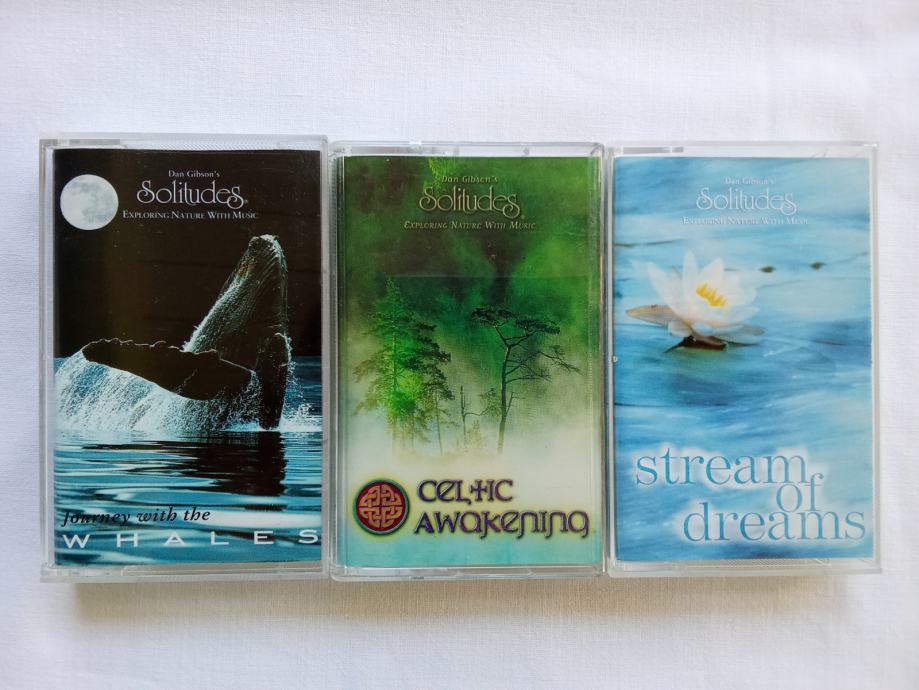 Zajedno za 10 € ili pojedinačno po 8 €, prodajem tri kasete albuma Dan Gibson's Solitudesa, u odličnom stanju. Čini mi se da su samo par puta slušane. Riječ je o albumima "Journey With The Whales", "Celtic Awakening" i "Strean Of Dreams". Fotografije priložene uz oglas prikazuju ovdje oglašene predmete.