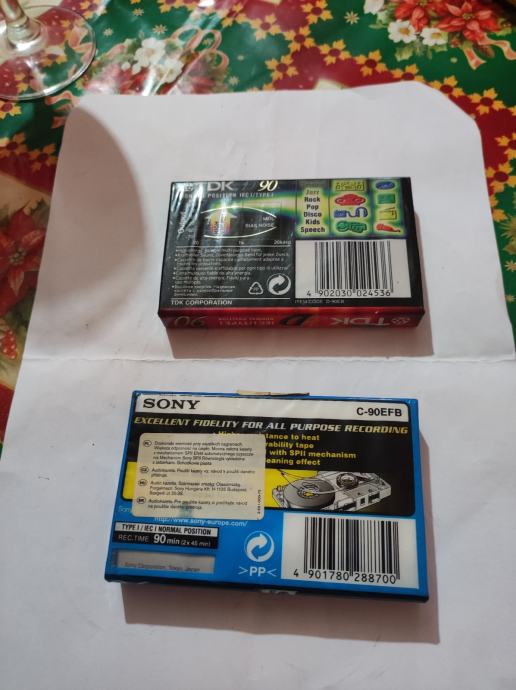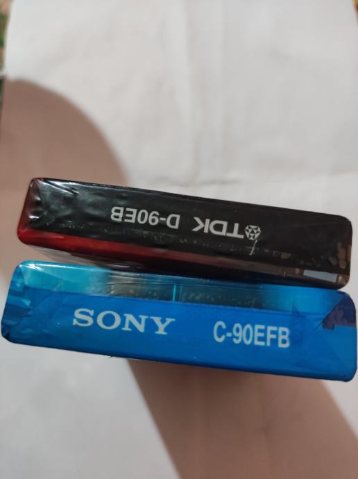 dvije audio kasete poznatih proizvođača - TDK D90 i SONY EF 90 nekoristene ,zapakirane. TDK kaseta je u crvenoj varijanti, dok je SONY u plavoj. Obje kasete su trajanja 90 minuta i namijenjene su za normalnu poziciju. SONY kaseta ima oznaku C-90EFB i nudi izvrsnu vjernost zvuka za sve namjene snimanja komad 3.50e