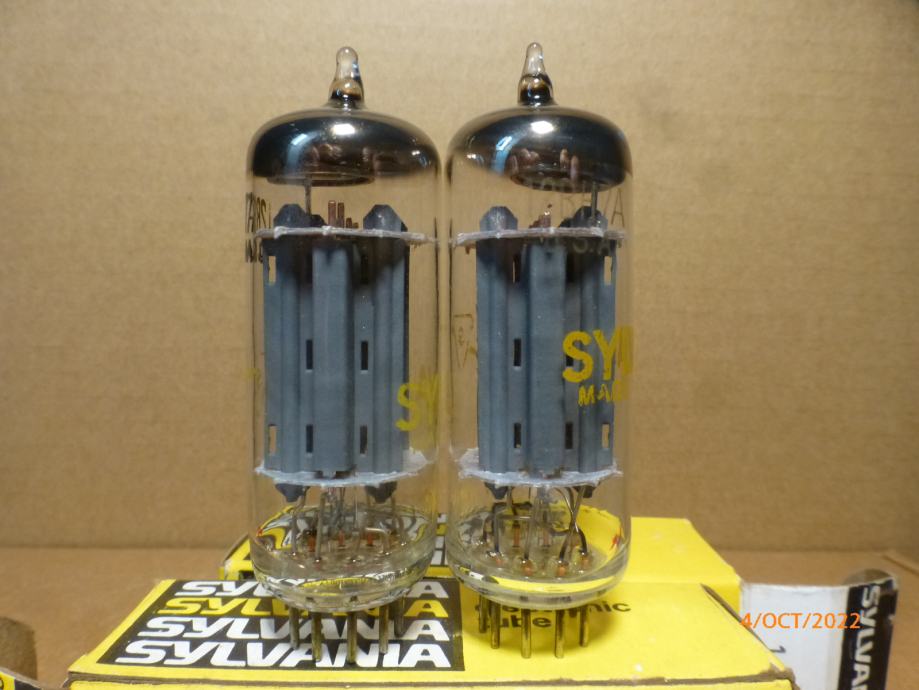 Odličan NOS par uparenih 12BH7 Sylvania cijevi. Konstrukcija sa tzv. visokim anodama iz 60-ih godina prošlog stoljeća, odnosno iz zlatnog doba ondašnje američke proizvodnje.