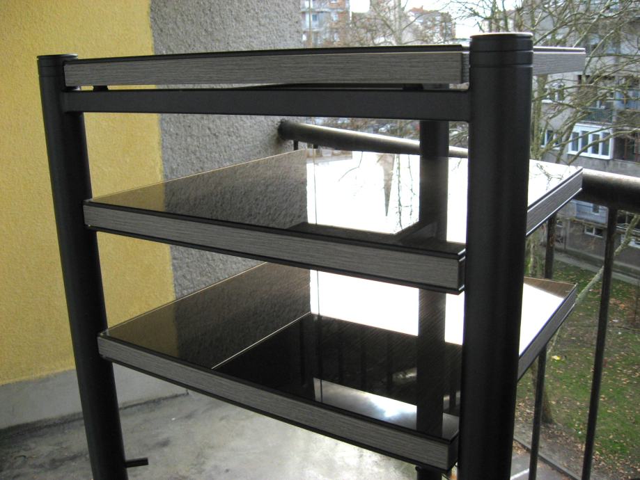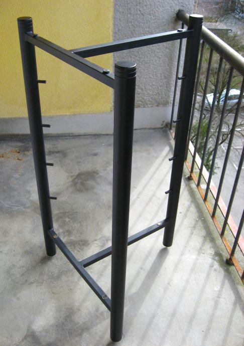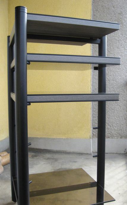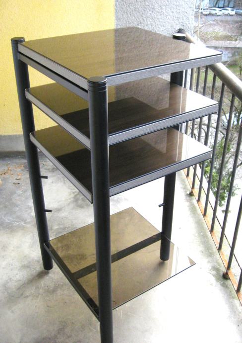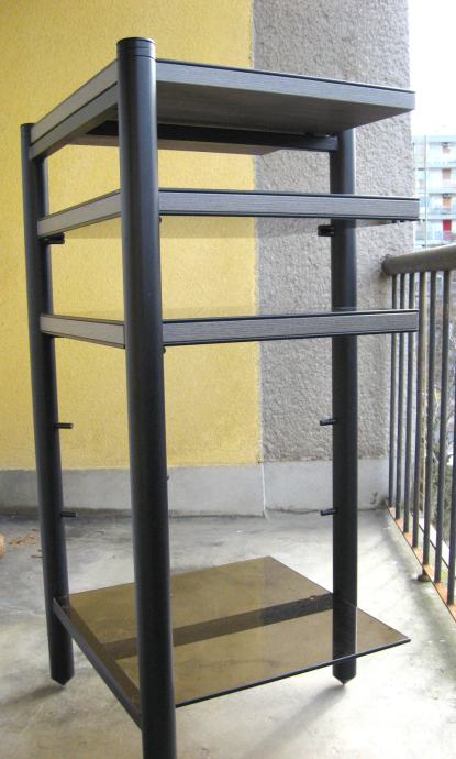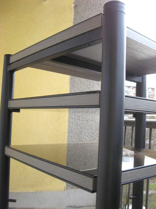 Prodajem jako malo korišteni a ujedno po mjeri napravljen te vrlo dobro očuvani stalak za audio komponente . Vanjske dimezije su 110 x 60 x 55 cm . Na raspolaganju je 6 nivoa (49 cm širina x 49 cm dubina) . U kompletu dolazi 6 kaljenih staklenih ploha i 3 drvene ploče koje možete po želji kombinirati . Težina samog stalka je oko 25 kg , a postoji i dodatna mogućnost punjenja cijevi . Stalak stoji na tri šiljka što ga čini posve stabilnim .