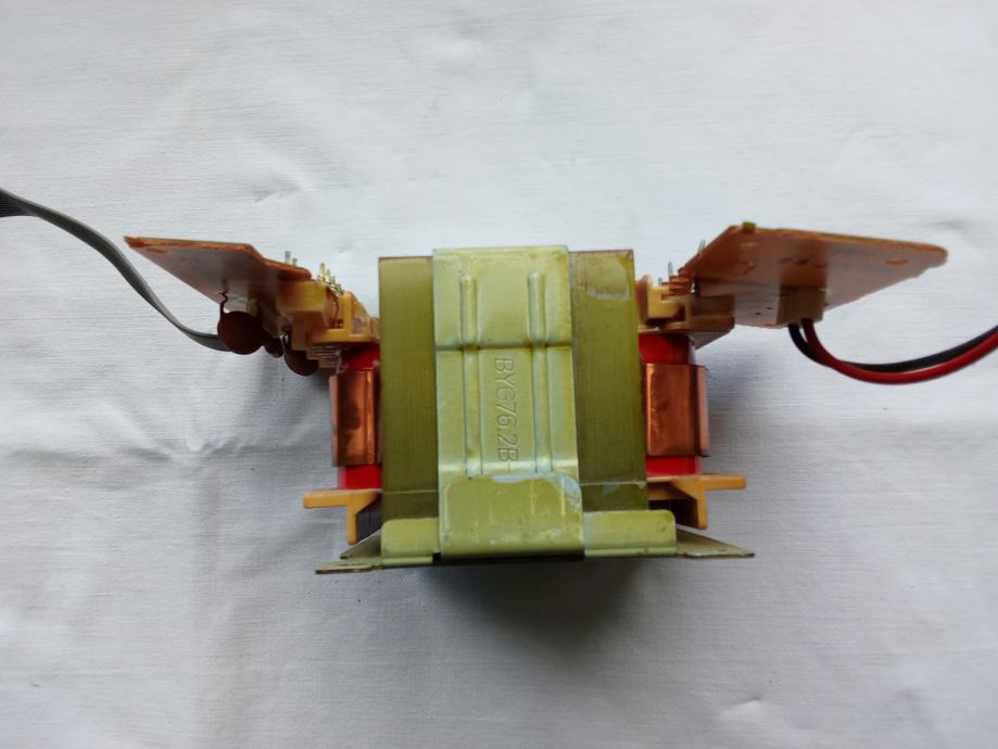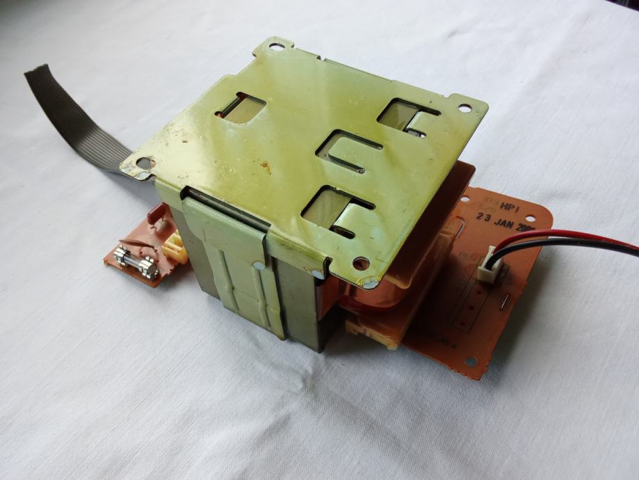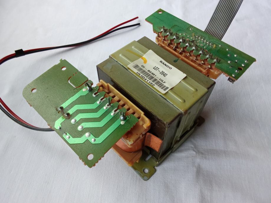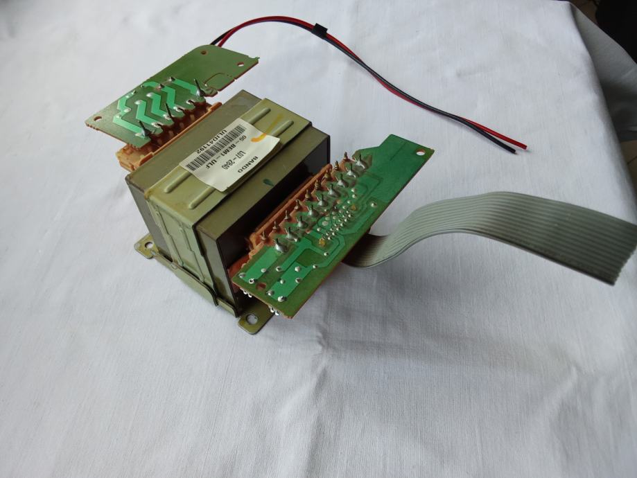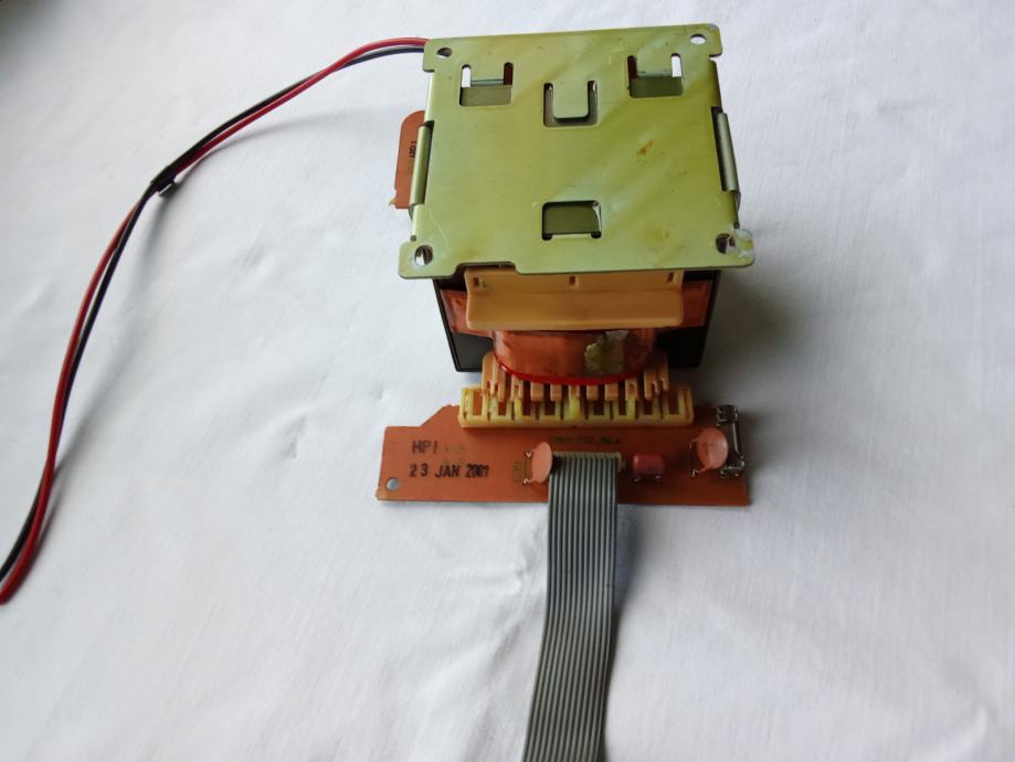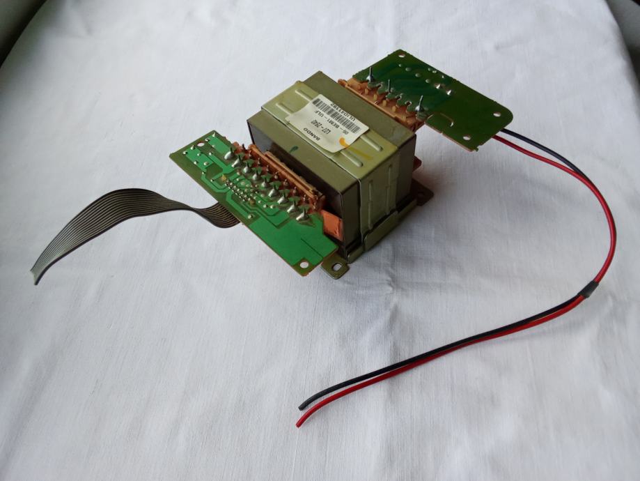 Ispravan je. Pripadao je glazbenom centru (liniji) Kenwood RXD 353. Priključen na mrežu napona oko 240 V, daje nekoliko sekundara napona 4, 7, 8, 9, 10, 12, 19, 22, 24, 30, 32, i po jedan sekundar 38, 41, 43, 50, 64 i 72 V. Glede kombinacija, siguran sam samo u 2x32 V. Njegova masa je 2.5 kg, a gabarit bez pločica 117x85x71.