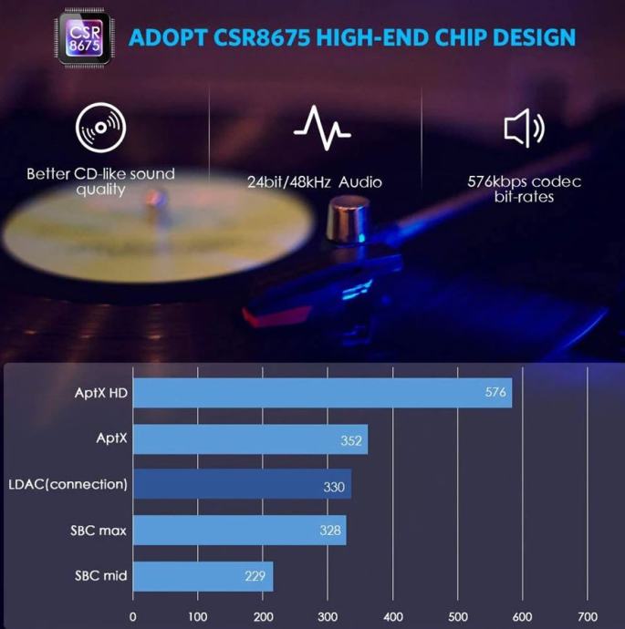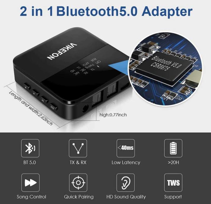 Uz ovaj 2u1 uređaj, vaš stari gramofon iz zlatnih godina 20. stoljeća možete lako povezati sa svim modernim BT zvučnicima bez dodatnih pojačala i kablova ... to najnovijom i najbržom BT vezom v5.0.
