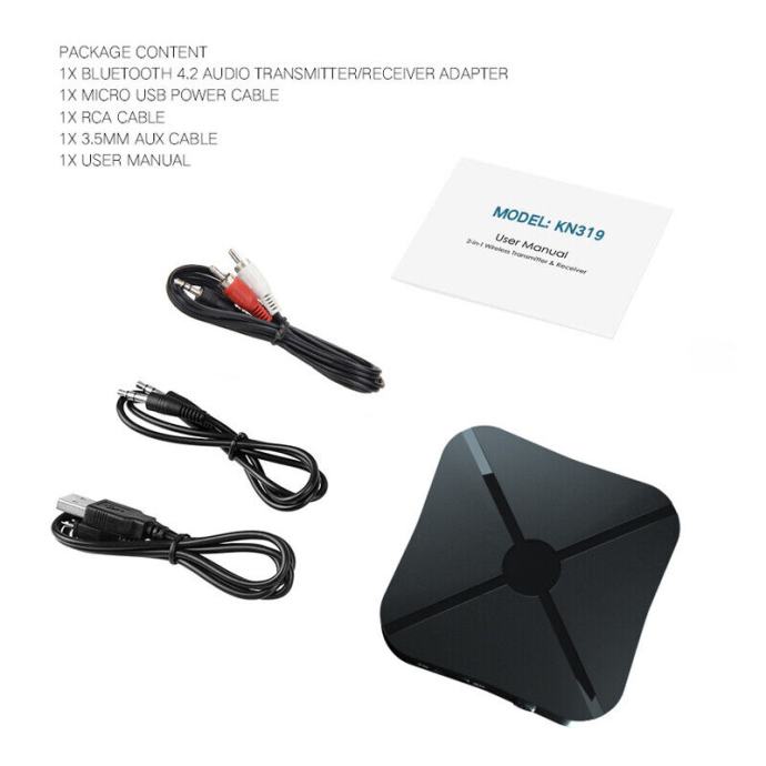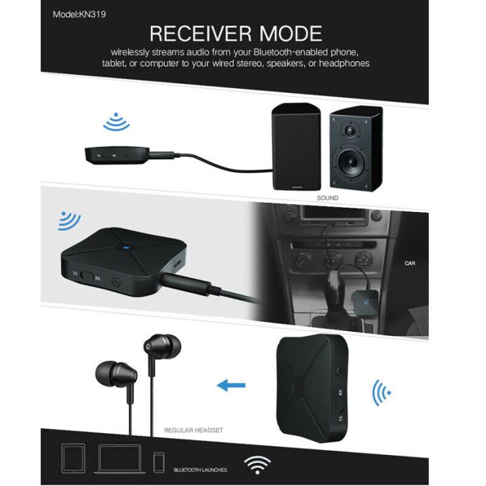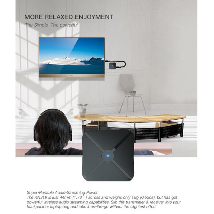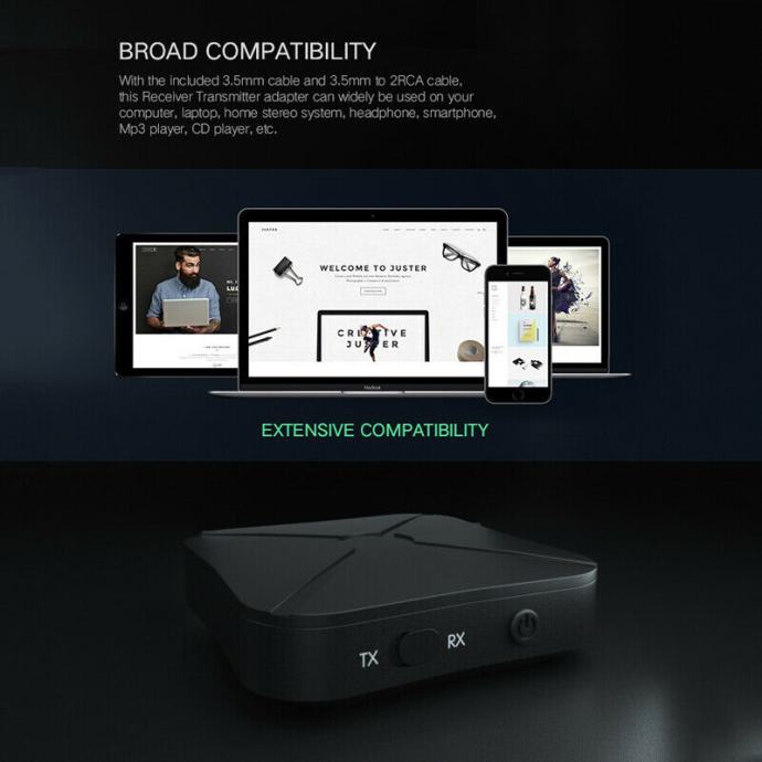 6. Široka kompatibilnost: S priloženim 3,5 mm kabelom i 3,5 mm na 2RCA kabelom, ovaj adapter za odašiljač prijemnika može se široko koristiti na vašem računalu, prijenosnom računalu, kućnom stereo sustavu, slušalicama, pametnim telefonima, MP3 playeru, CD playeru i tako dalje