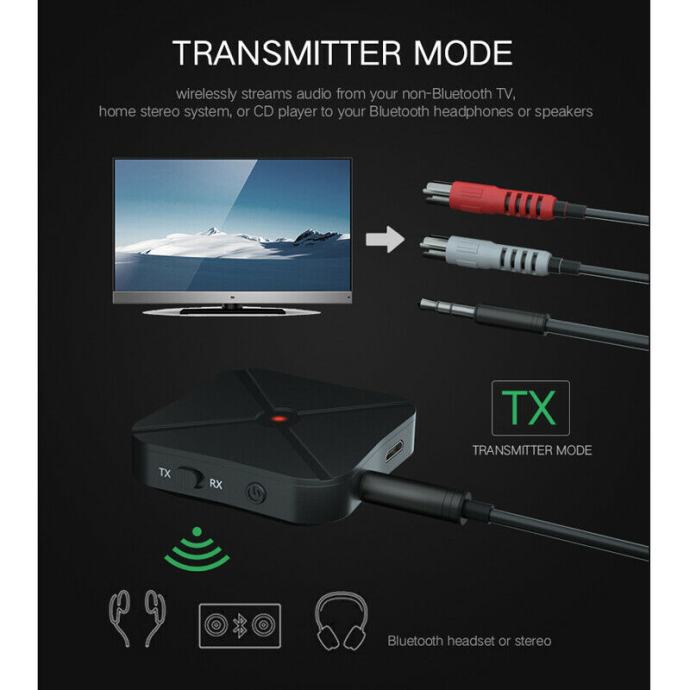 2. Način rada odašiljača: bežično struji zvuk s vašeg TV-a koji nema Bluetooth, kućnog stereo sustava ili CD playera na vaše Bluetooth slušalice ili zvučnike