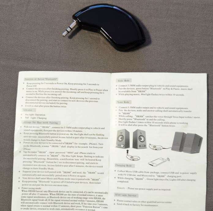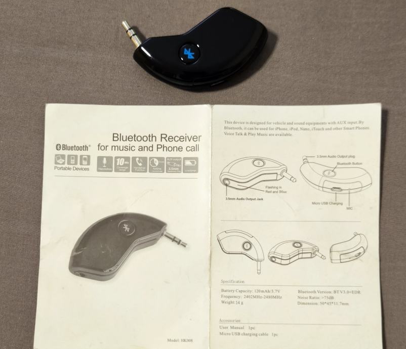 Prodajem bluetooth prijemnik namijenjen uređajima koji imaju AUX ulaz (3,5 mm priključak). Radi se o modelu HK008 koji omogućuje bežično povezivanje s mobitelom ili drugim bluetooth uređajem radi slušanja glazbe ili primanja poziva.