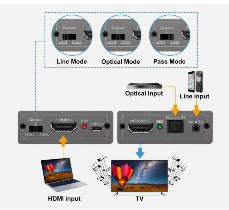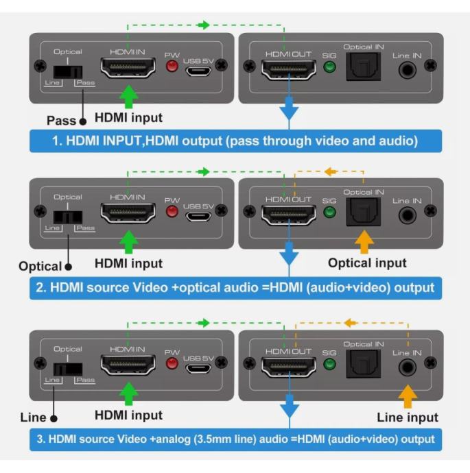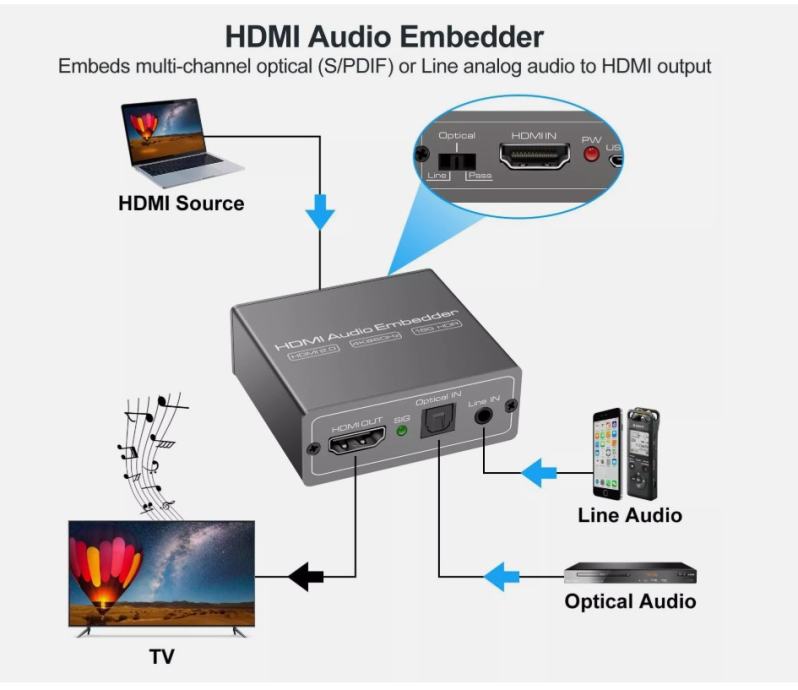 Digtal/Analog audio to HDMI embedder inserter】Use external audio from either digital (optical---TOSLINK/SPDIF) or analog (3.5mm/line) sources to replace the audio from an HDMI signal(Note that the original HDMI sound is replaced, not mixed with the original HDMI sound.). Flip a switch and choose which source you’ll hear on your HDMI display without moving cables. Also, you can choose to hear the original HDMI audio through the pass through feature.