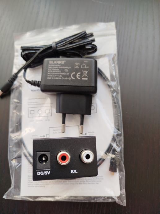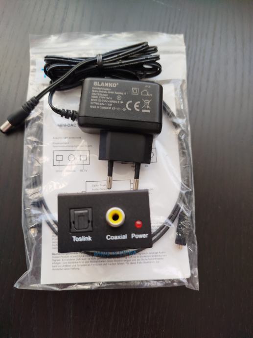 Mini-dac Dynavox sa optičkim(toslink) i coaxial ulazom za spajanje tv-a na analogno pojačalo.Dolazi sa optičkim kabelom i napajanjem.