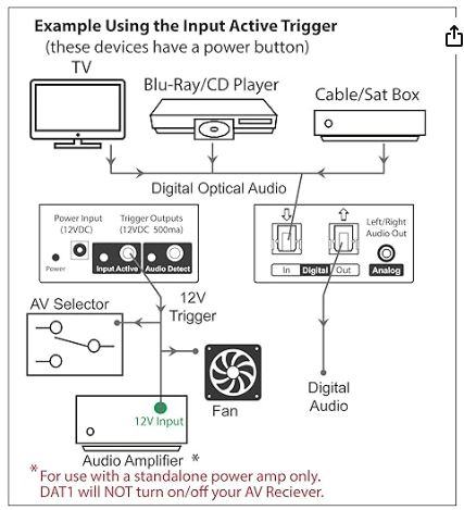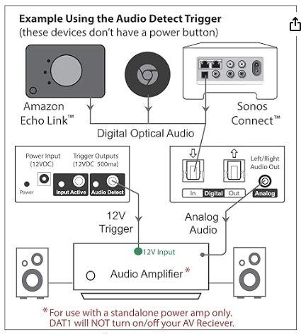 Add a 12 Volt trigger! Compatible with SONOS Connect, Echo Link, ChromeCast Audio, TV or any AV device with a digital/optical audio output