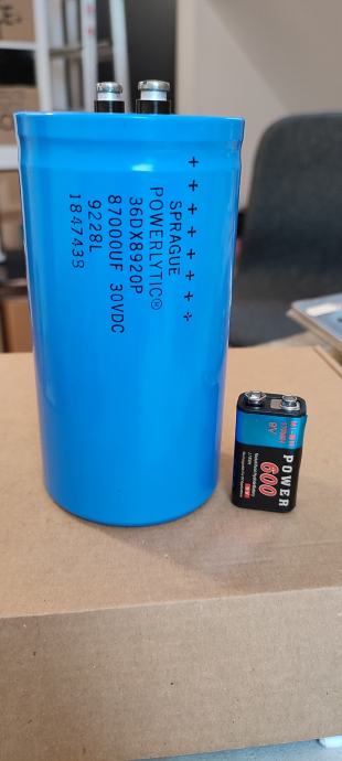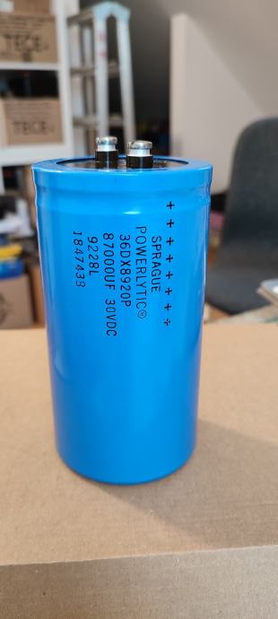 Američki elektrolitski kondenzator (elektrolit) SPRAGUE kapaciteta 87000 uF velikih dimenzija. Priključnice sa vijcima koji se isporučuju sa kondenzatorom. Stara škola!