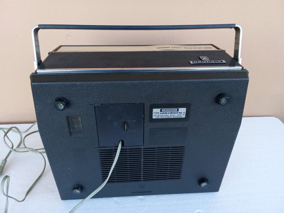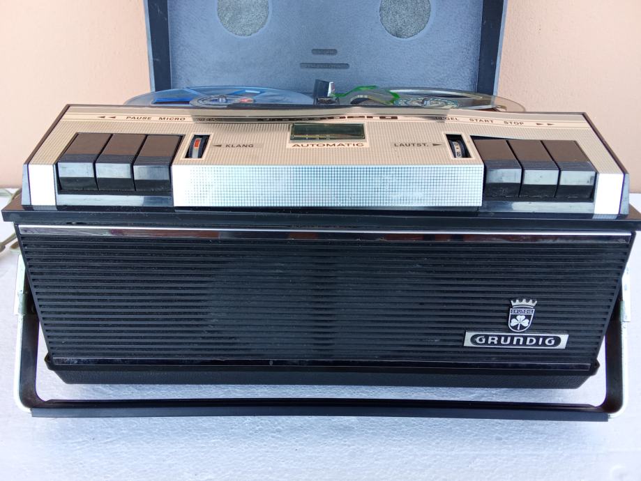 Kada ga upalim, čujem da motor radi, ali su vrlo vjerojatno remeni propali pa nema prijenosa vrtnje s njega na kolutove. Nisam ga otvarao, pa postoji i mogućnost da su remeni čitavi i u dobrom stanju, tj. da je uzrok neispravnosti nešto drugo. Dok motor radi, iz uređaja dopire smrad, kao da da je nešto spaljeno. Na gornjoj strani uređaja nedostaje pločica sa Grundigovim znakom, a limena obloga kućišta oko tipki je izobličena. Fotografije priložene uz oglas prikazuju ovdje oglašeni uređaj. Cijena je fiksna, ne uključuje cijenu dostave, ali može biti 10 € niža u slučaju osobnog preuzimanja, pod uvjetom da mi se kupac maksimalno prilagodi glede vremena i mjesta kupnje, bez zadržavanja.