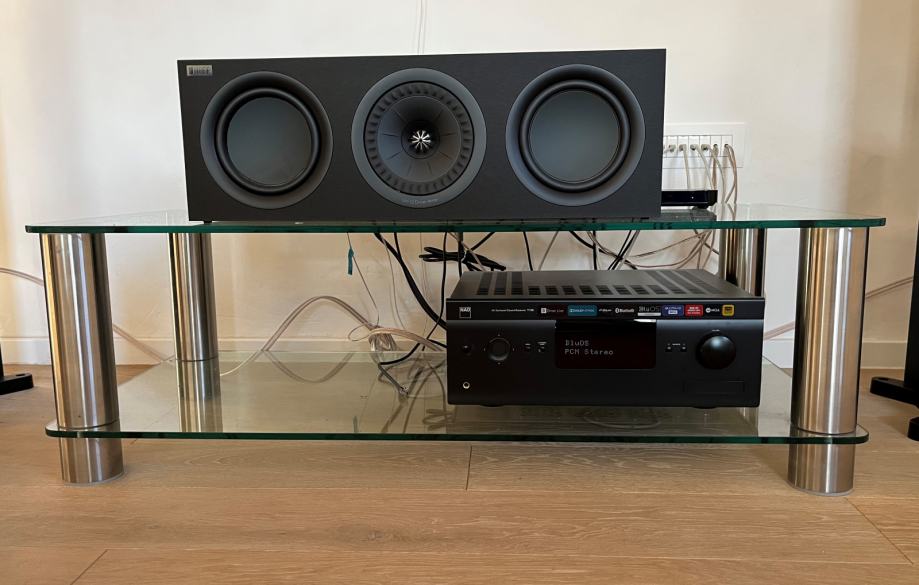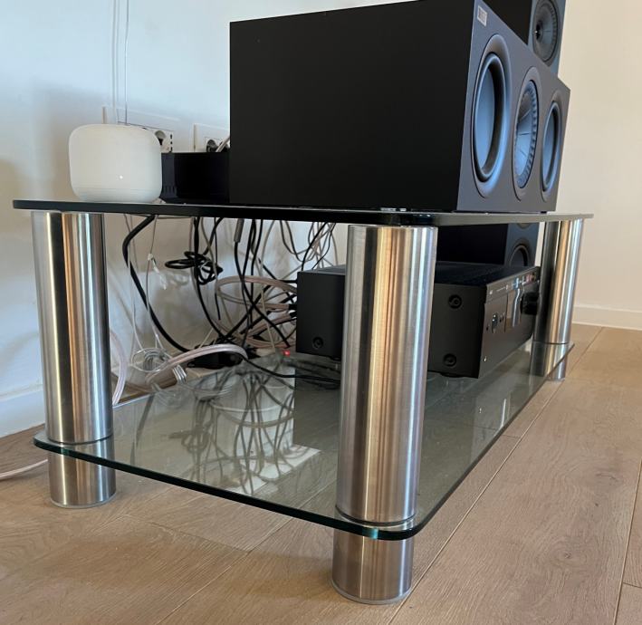 Stakleno/metalna polica za Hi Fi komponente ili TV. Dimenzije (Š×D×V): 112×50×36 cm. Staklene police su od 10mm kaljenog stakla. Inox metalne noge su na navoj, tako da je policu moguće jednostavno rastaviti. Konstrukcija je jako stabilna.