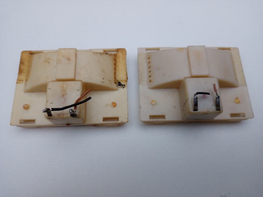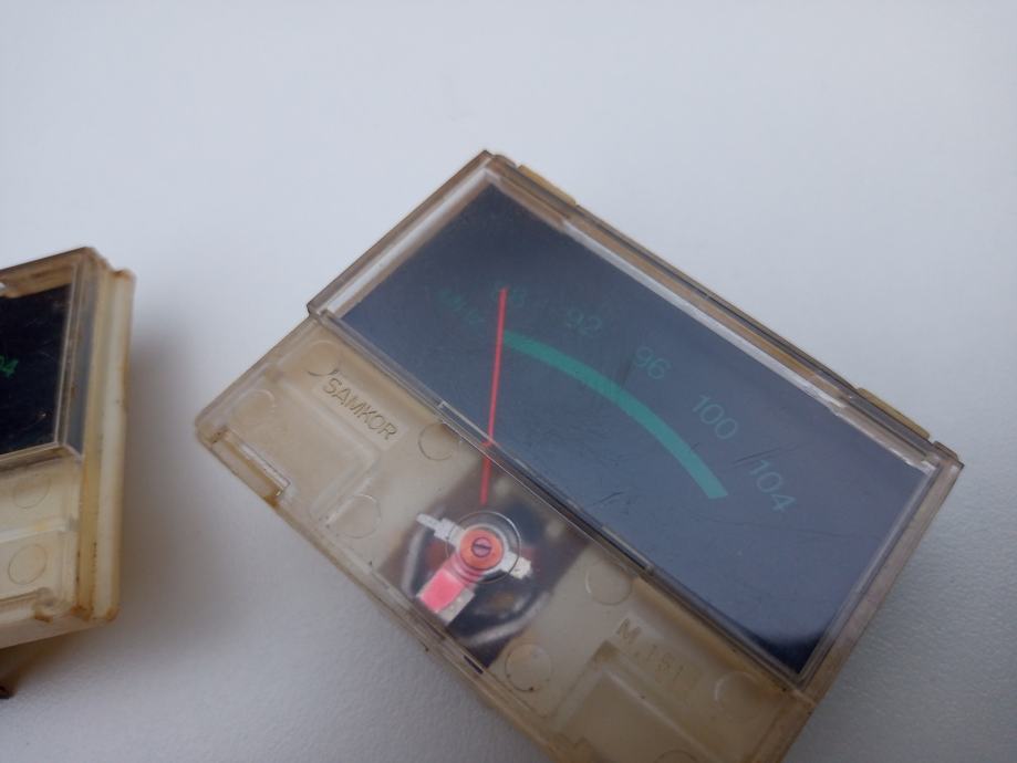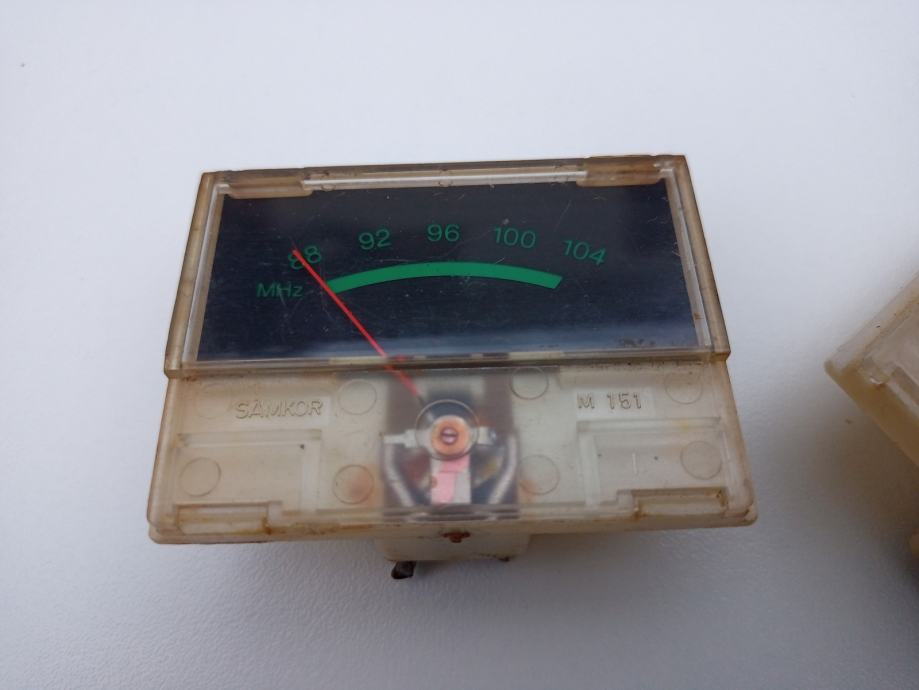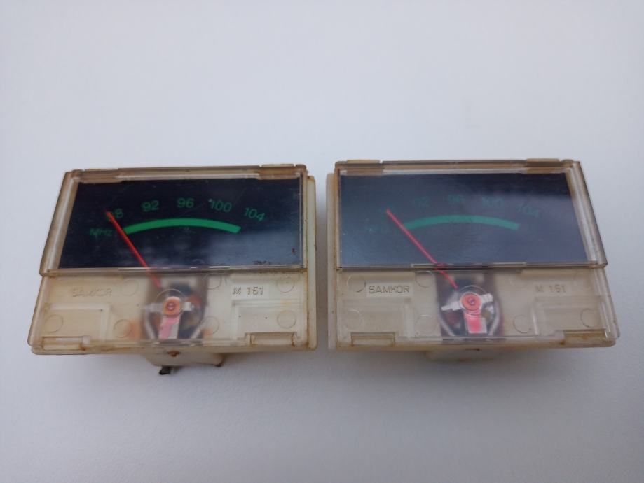 U paru za 10 € ili pojedinačno po 5 €, prodajem instrumente koji pokazuju FM frekvencije. Nisam zabilježio ni naziv proizvođača niti naziv modela uređaja kojemu su pripadali. Ispravni su, a provjereni su analognim multimetrom. Fotografije priložene uz oglas prikazuju ovdje oglašene predmete, a, na zahtjev kupca, mogu ih besplatno polirati. Mjere prozora, odnosno onoga što se vidi kada su ugrađeni su 60x29 mm (60.1 x 27.92), a mjere bijelog okvira su 64.27x46.29 mm. Nedostaju lampice i nosači lampica.
