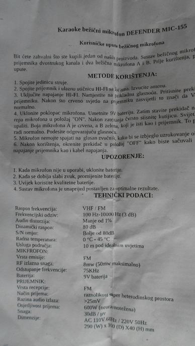 Karaoke bežični mikrofoni DEFENDER MIC-155