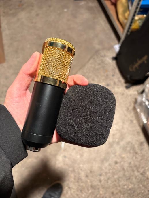 Prodajem kondenzatorski mikrofon BM800 u crno-zlatnoj boji s pratećim phantom power supply napajanjem. Mikrofon dolazi s držačem za postavljanje na stalak i spužvom protiv neželjene buke/vjetra. Phantom napajanje omogućuje napajanje mikrofona i ima XLR priključke za profesionalni audio signal. Pogodan je za snimanje vokala, podcastova, streaminga i slične potrebe u kućnom studiju.