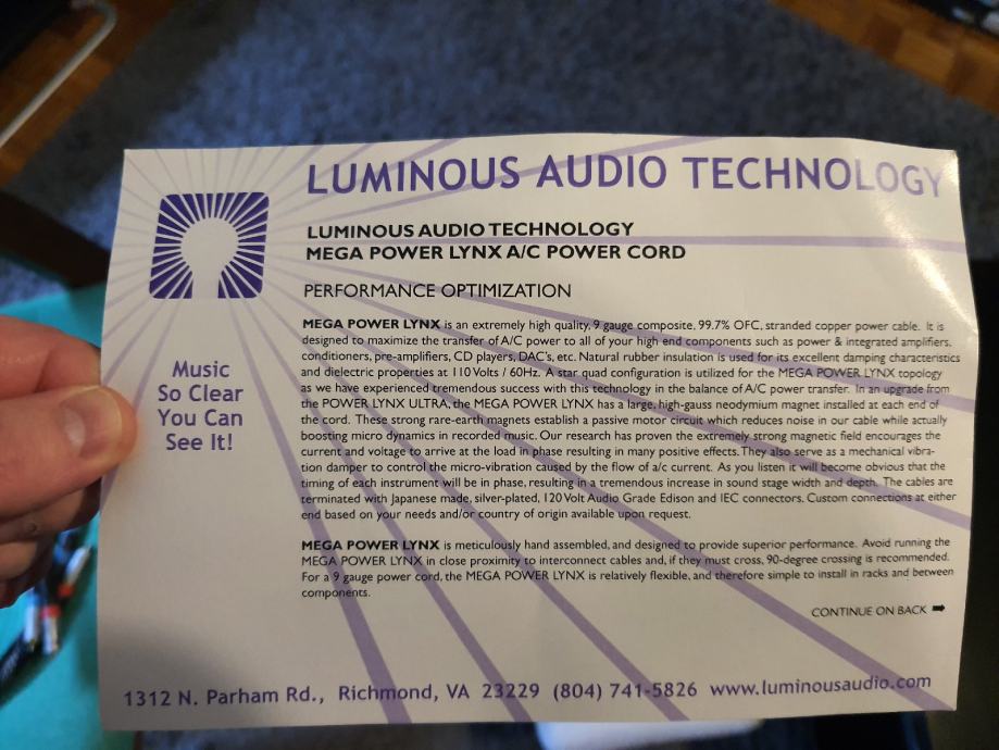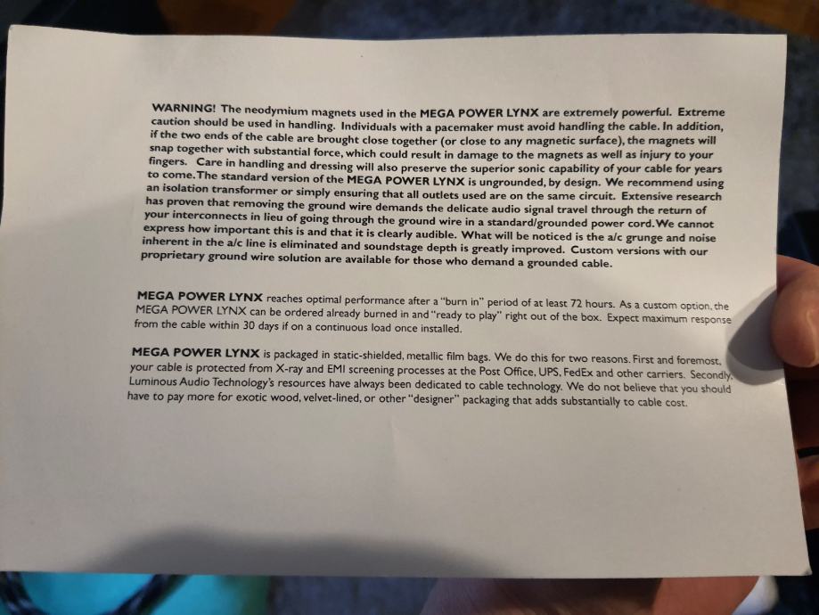 "Kabel ima veliki neodimijski magnet visokog gaussa instaliran na svakom kraju kabela. Ovi jaki magneti uspostavljaju pasivni motorni krug koji smanjuje šum u našem kabelu dok zapravo pojačava mikrodinamiku u snimljenoj glazbi. "