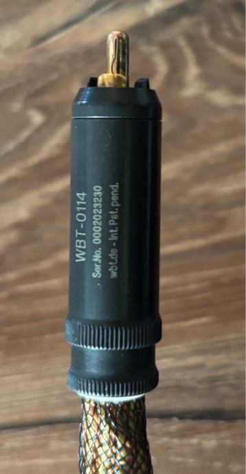 Signal Conductor: TMT high purity multicore soft annealed long crystal silver 21AWG, 0.41mm2. Dielectric: Mulberry silk braided tubing, high quality low resistance tinned copper expandable braided RF & MF protection shield, P.T.F.E. protection. Finish: Expandable single core braided sleeving over golden, polished cotton tubing. Wbt 0114 ag RCA/ Neutrik cxx connectors. Solid olive wood for controled disipation of vibration.