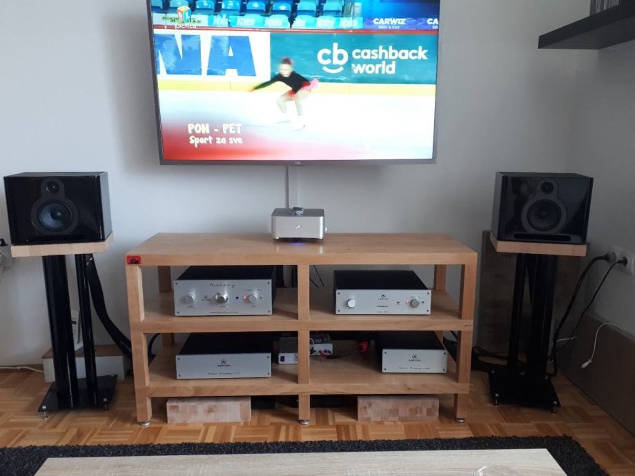 6 nosivih stupaca sa nivelirajućim/ podesivim antirezonantnim šiljcima (Mesing/Bakar). Osjetna razlika u funkcioniranju/reproduciranju vašeg audio sustava naspram smještaja na klasični namještaj, tv stalke, "kredence" ili slično... Mogućnost izrade u drugim dimenzijama/vrstama drveta/oblicima/finišima itd... Istaknuta cijena je za policu izrađenu od Trešnje (prvih 11 fotografija)