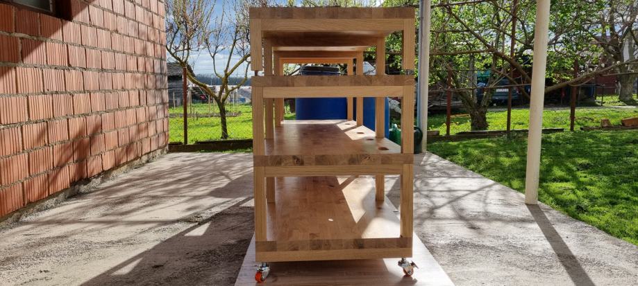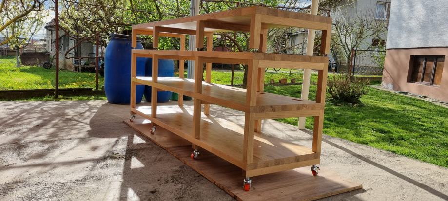 Sama Polica je izrađena bez trunke metala, znači samo puno drvo visoke kvalitete, spajano sa profesionalnim ljepilom i drvenim klinovima, te finiširana sa vrlo kvalitetnim mat lakom. Namjenjena za smještaj svih mogućih audio/video komponenti, Tv-a i slično a nosivost je praktično neograničena govoreći u normama audio uređaja (prazna sama sa 3 segmenta teži cca 150kg). Dvije najgornje i modularna imaju rupe predviđene za "cable management". Osjetna razlika pri funkcioniranju/reprodukciji audio sustava naspram klasičnog namještaja, tv stalaka, "kredenaca" i slično a samim time unikatan i poseban, te kvalitetan komad namještaja. Moguća izrada i u drugim dimenzijama/oblicima, materijalima/vrstama drveta. Izražena cijena na oglasu je za komplet sa 4 segmenta, cijena bez modularnog znači 3 fiksna je 1060 eura.
