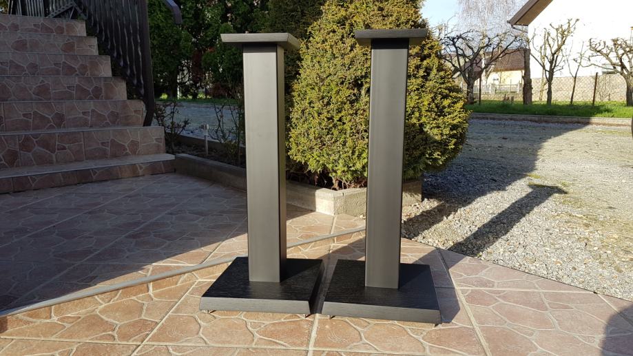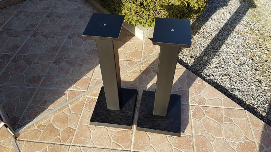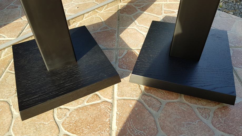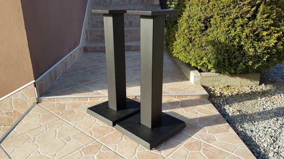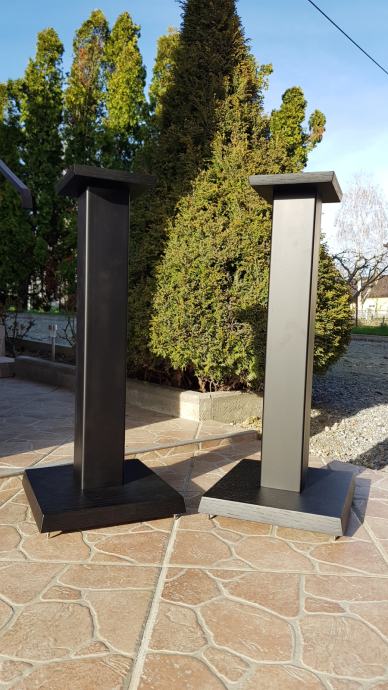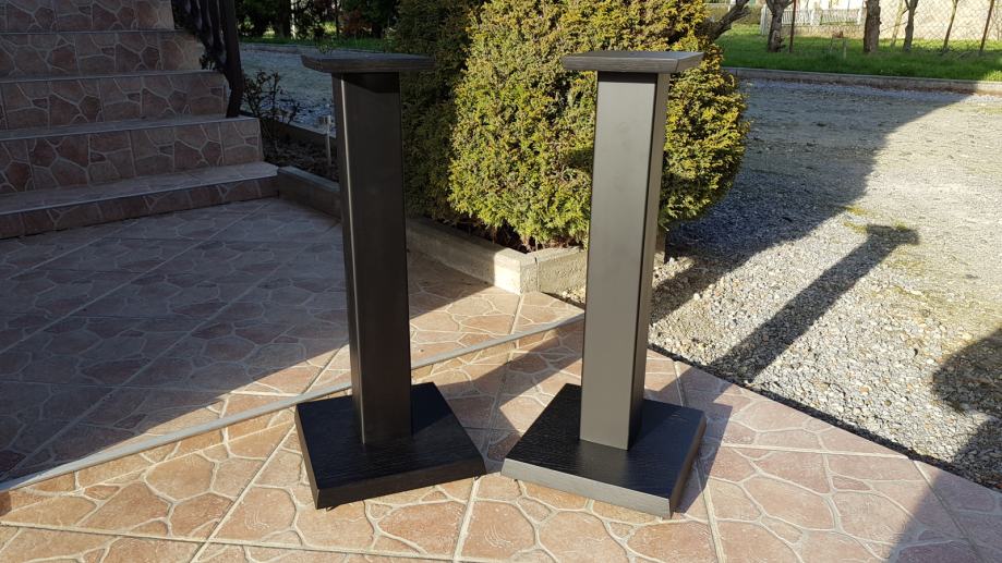 Novi stalci za zvučnike, visine cca 60cm, šiljci(inox/krom).Moguće razne varijacije u bojama, oblicima ploha, visina, itd. Donja ploha hrast debljine 40mm, gornja ploha hrast 20mm , cijev 80 x 80 mm, finiš crni mat, mogućnost punjenja. Cijena je za par.