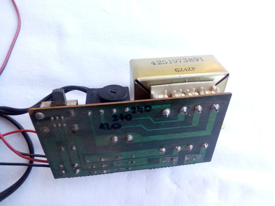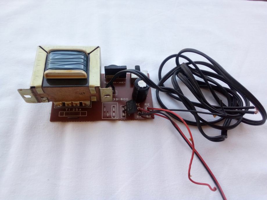 Ispravan transformator, skinut sa radio-kasetofona Sanyo M-W3K. Ima sklopku za korištenje na mržama sa naponom 240, 210 i 120 Volta. Ima dva sekundara koji, kada je priključen na 240 Volta, daju po 10.5 Volta. Spojen je na ispravljač koji ima izlaz od 13.6 Volta. Masa sa pločicom je 615 grama, a gabarit samog transformatora bez pločice je 60x50x50 mm.