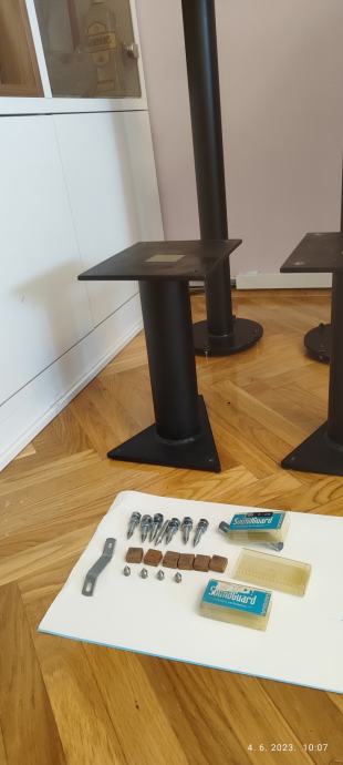 KOMPLET 2 + 2 VRHUNSKA METALNA STALKA ZA VRHUNSKI HiFi ZVUK PRODAJEM. RADI SE O RUČNOM RADU PO NACRTU IZ HIFI ČASOPISA. MASIVNI METALNI TUB I MASIVNA METALNA PLOČA SU POVEZANI VRHUNSKIM VAROM PROFESIONALCA. TUBOVI SU ZA UMRTVLJENJE NAPUNJENI PIJESKOM A NA PODU STOJE NA ŠILJCIMA.NA DOSJEDIMA ZA ZVUČNIK JE POLOŽENA TRAKA ZA PRIGUŠIVANJE VIBRACIJA.