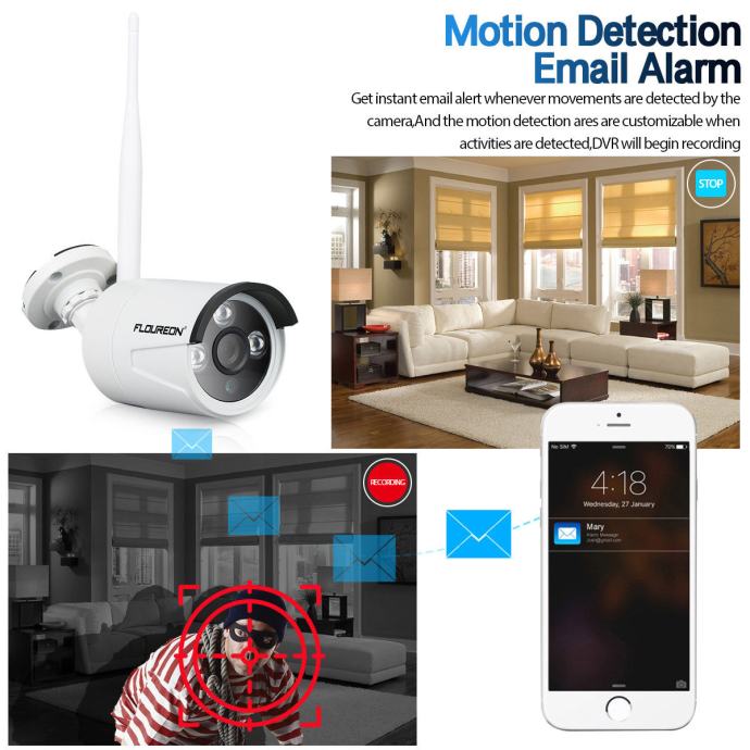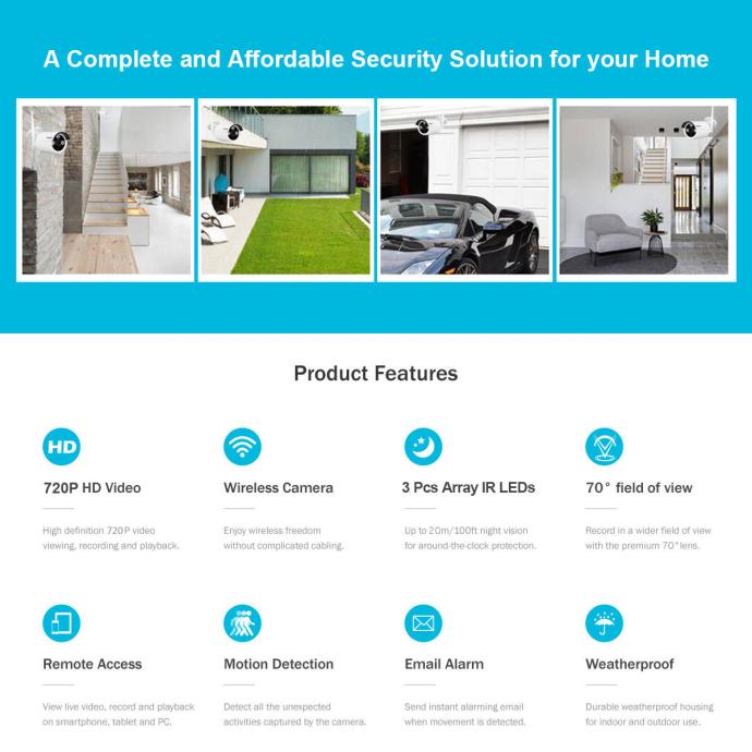 Komplet HD video nadzor sastoji se od 2 x WIFI HD kamere 720P rezolucije i uređaja za snimanje video nadzora u realnom vremenu.