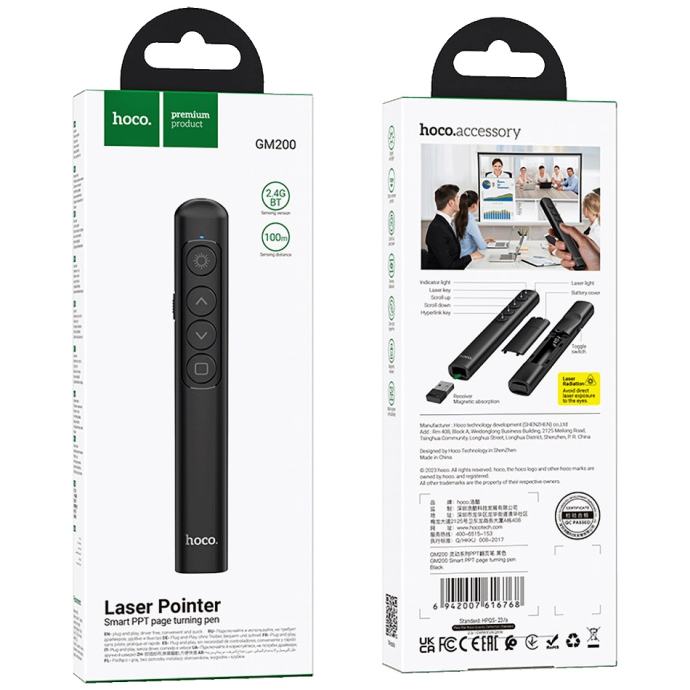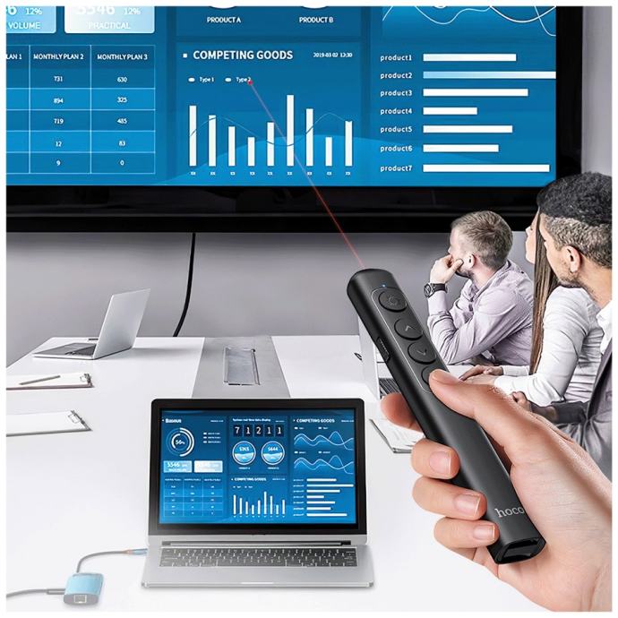 Pametni laserski pokazivač Hoco GM200 će vam postati pouzdan pomoćnik u vođenju raznih prezentacija. Uz pomoć ovog kompaktnog gadgeta možete usmjeriti pozornost publike na određene elemente slike, prebacivati slajdove, uključiti prikaz preko cijelog zaslona, a također otvoriti hiperveze. Crveni laser savršeno se ističe na bilo kojoj pozadini. Pokazivač ne zahtijeva instalaciju dodatnih upravljačkih programa za rad, a također radi dugo na samo jednoj bateriji. GM200 je također kompatibilan s mnogo različitih uređaja, a frekvencija od 2,4 GHz omogućuje stabilnu i brzu vezu.