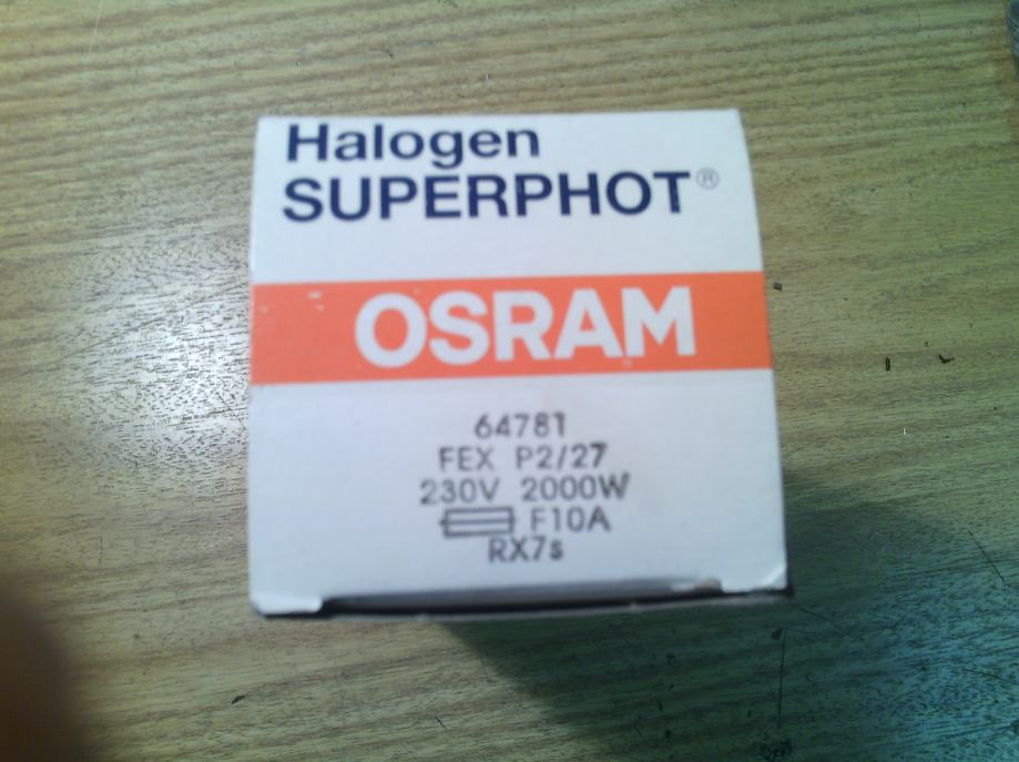 Prodajem halogene žarulje OSRAM Halogen superhot snage 2000 W tip 64781 FEX P2/27 RX7s. Koriste se u reflektorima (cvajerima) od 2000w za video i foto potrebe, kao na primjer COSMOBEAM 2KW firme Cosmolight.