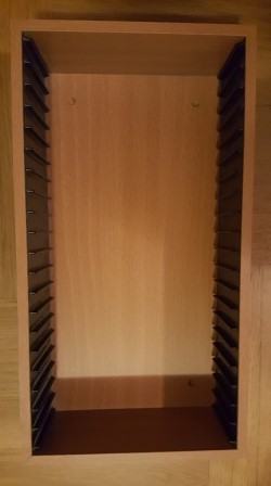 Drveni, boje bukve, korišten, neoštećen. Ukupno stane 20 standard DVD kutija (40 slim). Rupe za montažu na zid. Dimenzije 40x21,5x10 cm.