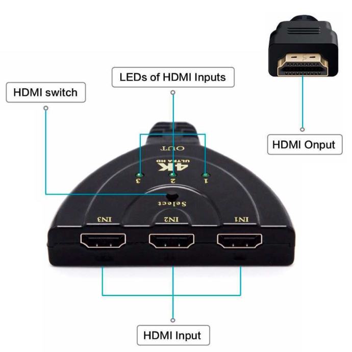 HDMI preklopnik omogućuje video visoke razlučivosti (u više rezolucija do 4K) i digitalni audio s bilo kojeg od tri uređaja