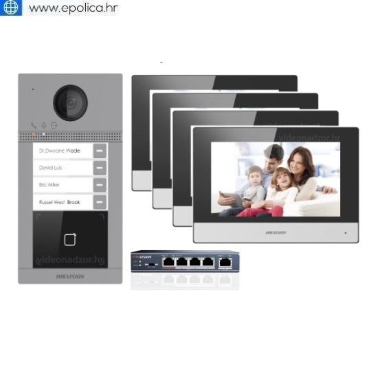 KOMPLET sadrži sve što Vam je potrebno za ČETIRI korisnika Vanjska jedinica sa tipkalom, unutarnja jedinica, switch , (imamo opciju za više i manje korisnika stanova ) .