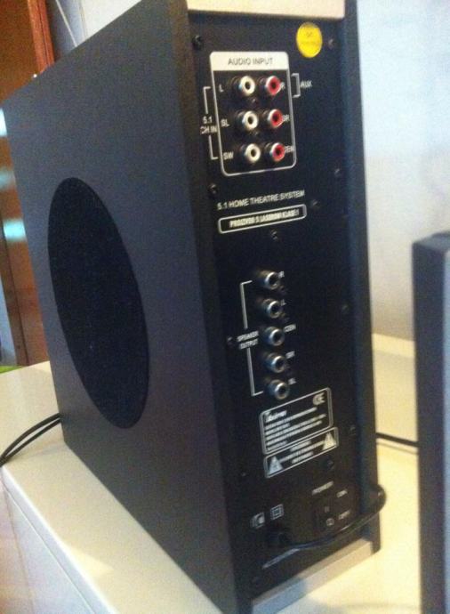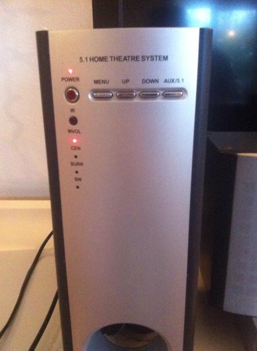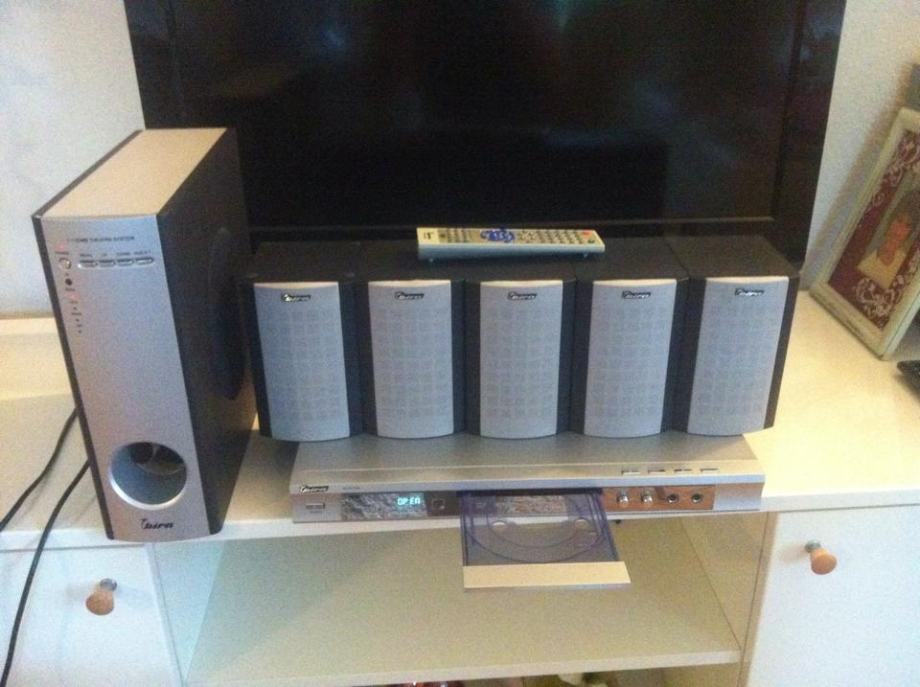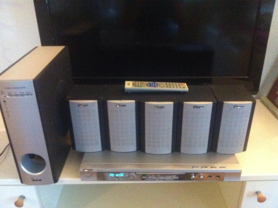 Novo nekorišteno kućno kuno sa DVD playerom, jednim glavnim zvučnikom i 5 manjih pogodnih za pozicioniranje bilo gdje u prostoriji.