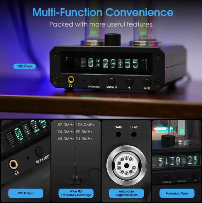 - Dizajn prilagođeniji korisniku: Podržava tri odabirljiva frekvencijska pojasa za globalnu pokrivenost. S podesivim pojačanjem cijevi i 7 razina svjetline VFD-a, to je elegantan ukras za stol koji nadopunjuje svako okruženje.