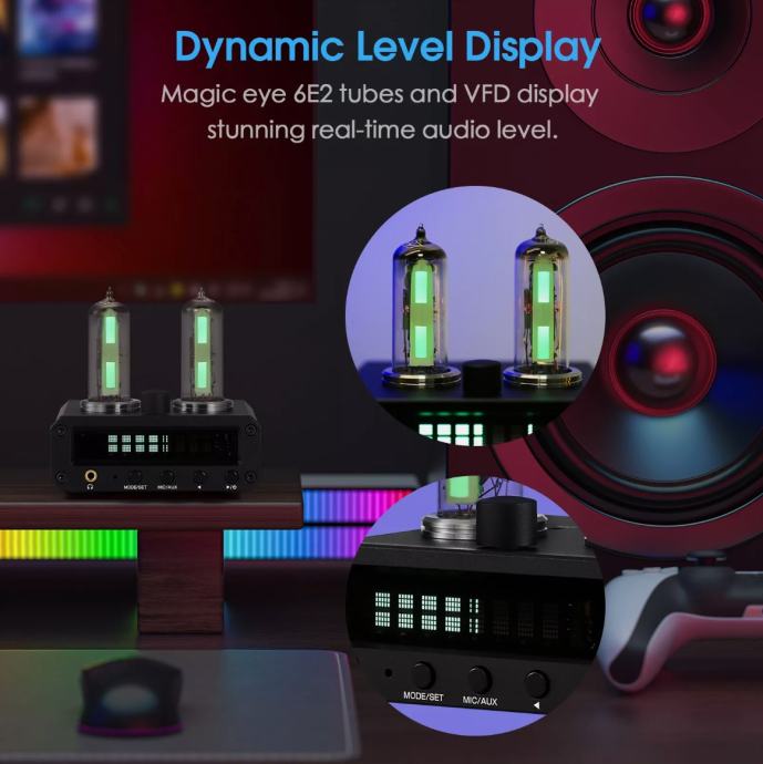 - Živopisan glazbeni spektar: VFD (Vacuum Fluorescent Display)zaslon i očaravajuće Magic Eye 6E2 cijevi oživljavaju vašu glazbu, prikazujući razine zvuka sinkronizirane s ritmom. Bilo da dolazi s mikrofona ili linijskog ulaza, puls i sjaj uranjaju vas u sliku i zvuk.