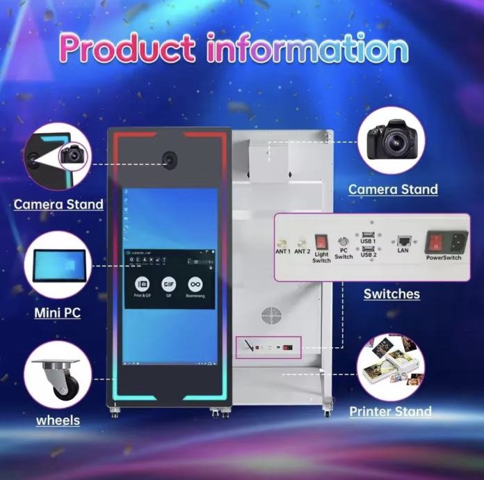 - Interaktivni touch-screen – korisnici mogu jednostavno dodirivati ekran za pokretanje snimanja, odabir skinova, okvira, naljepnica i opcija ispisa.