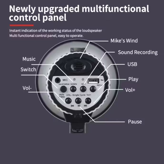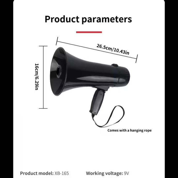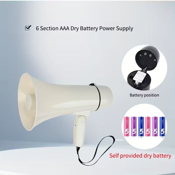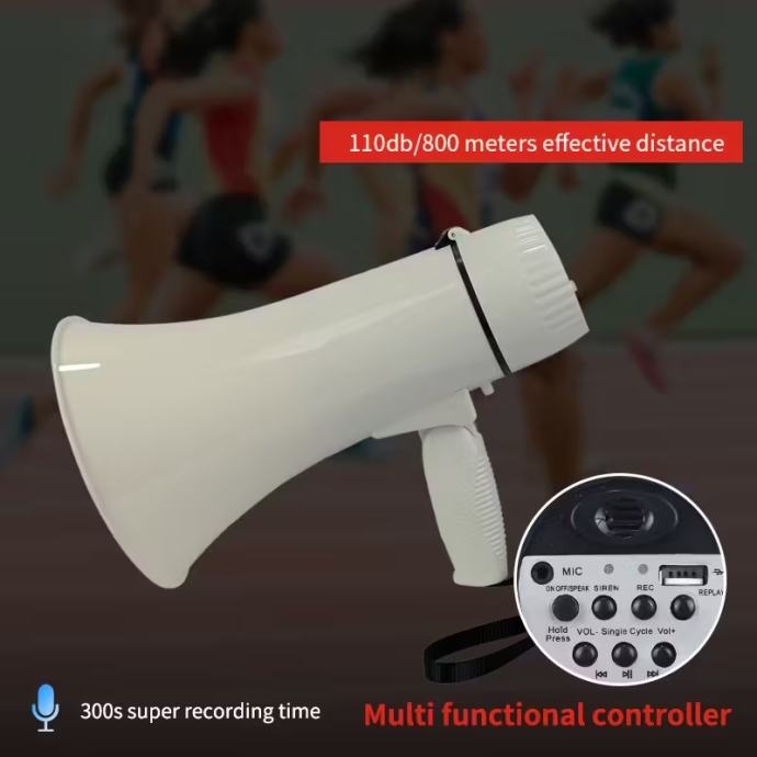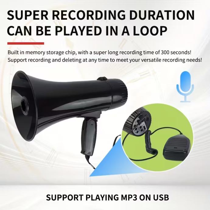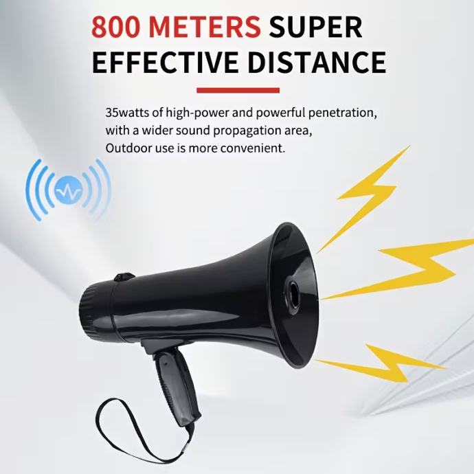 Prijenosni megafonski zvučnik snage 35 W, s načinima rada sirene i alarma, 240 sekundi snimanja, kompatibilan s USB flash pogonom, odvojivim ručnim mikrofonom, regulacijom glasnoće i remenom, bez baterije