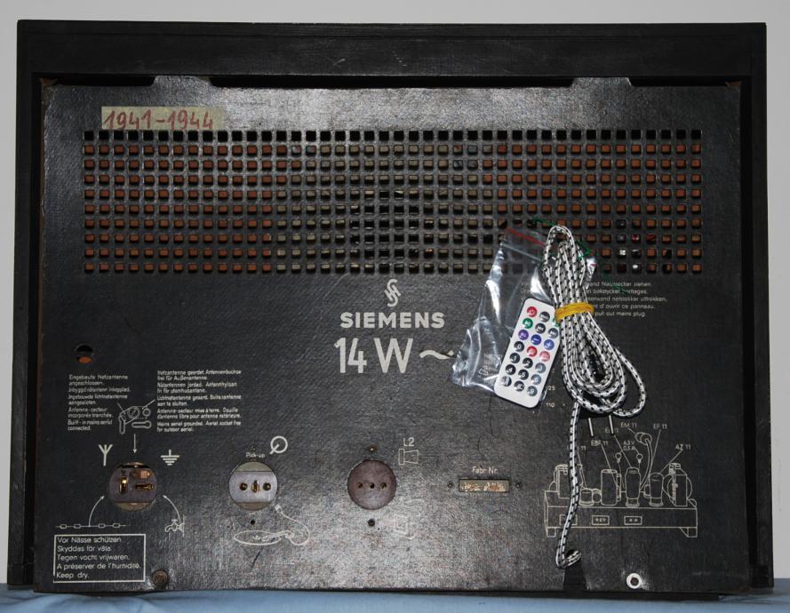 Prodajem stari radio njemačke proizvodnje marke Siemens, model 14W, proizvodio se u razdoblju od 1941. do 1944, godine. U to vrijeme nije bilo UKV emisije i zbog toga se radio danas u originalnom stanju ne može slušati. Da bi se radio danas mogao slušati u elektronski dio radija ograđen je suvremeni FM dekoder u frekventnom području od 88 -108 MHZ. Kutija je restaurirana pomoću originalnog laka - šelaka.