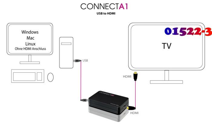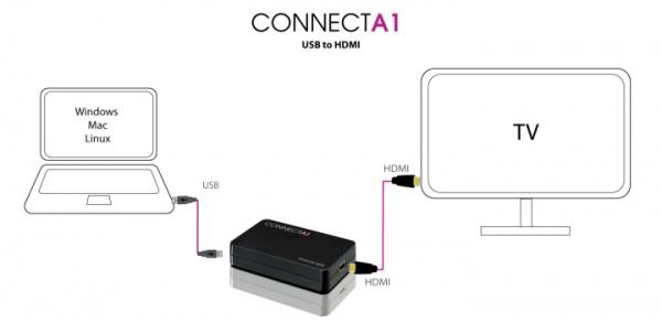 The TERRATEC CONNECT A1 can be used in several situations. It is a powerful device to turn a standard USB 2.0 connection into an HDMI port. This enables you to connect the computer or notebook without an HDMI port to an HD Display or TV through high quality HDMI. You can also connect additional displays besides the standard display connector that is already present on your system. All of which can be done on a MAC or Windows system in 1080p, Full HD (depending on your systems performance).