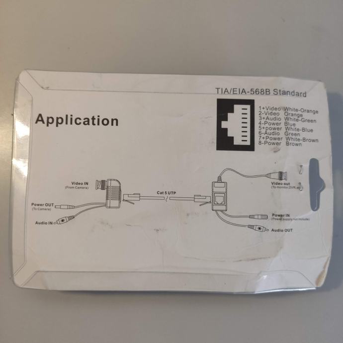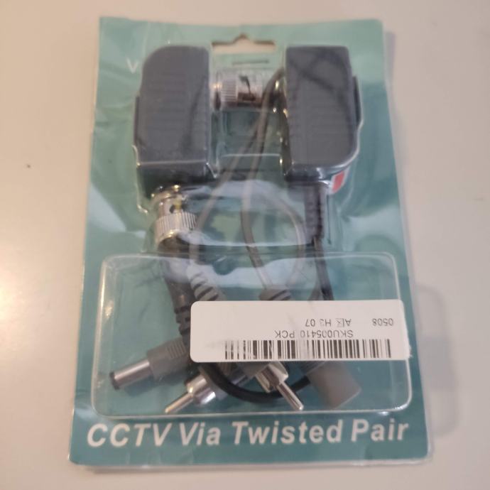 Dva balun adaptera, jedan za CCTV video server (npr. snimanje nadzora), a drugi za samu audio/video nadzornu kameru, za prijenos slike, zvuka i napajanja putem mrežnog Cat 5 UTP kabela. Prema standardu TIA/EIA 568B. Nikad otvoreno, nikad korišteno, zapakirano kao na slici.