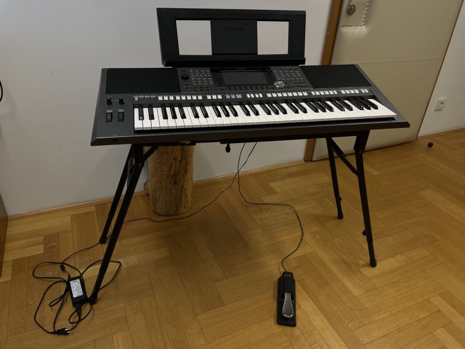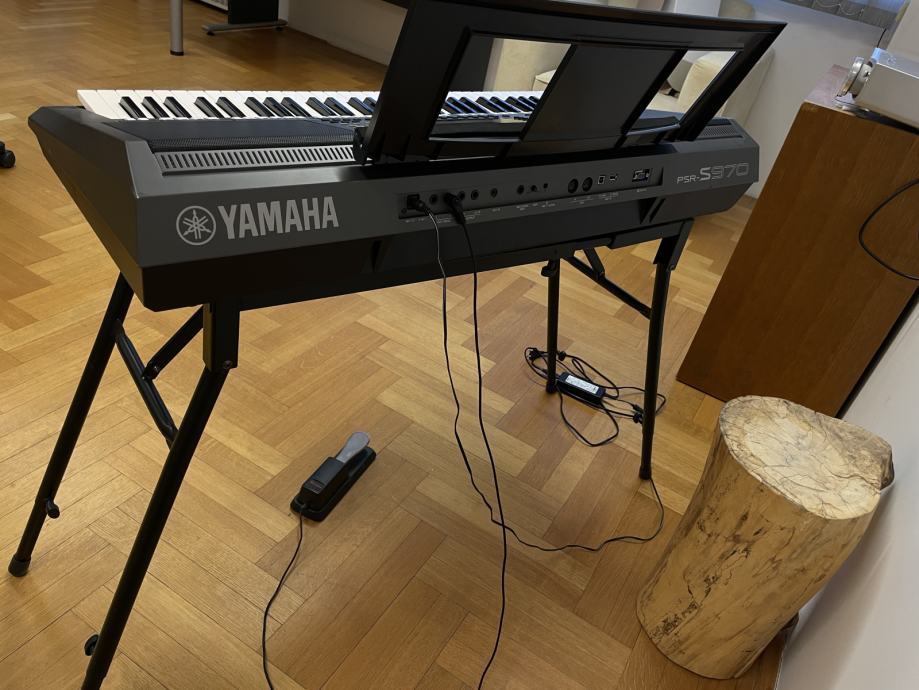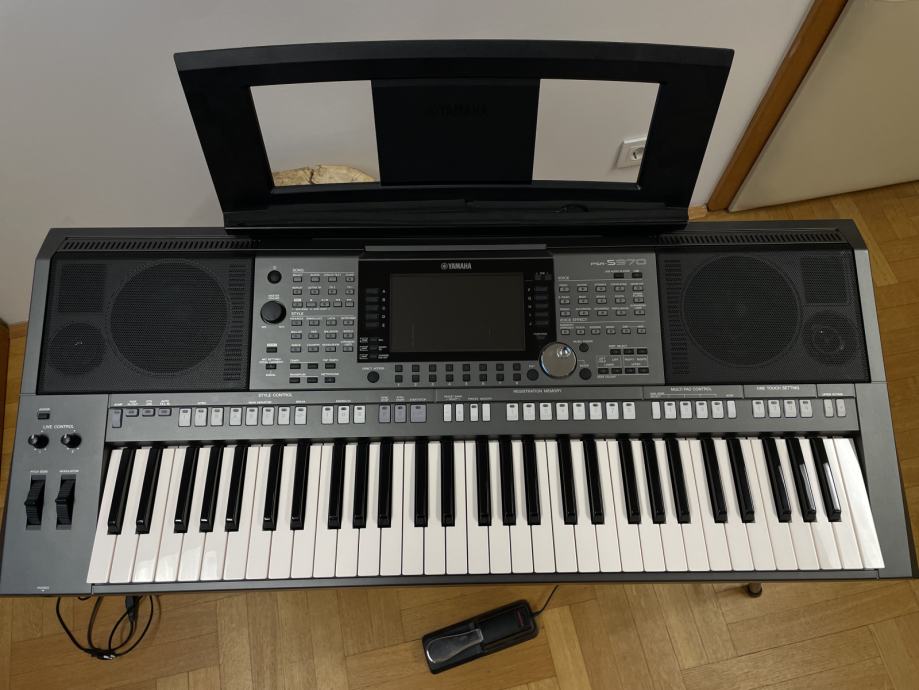 Yamaha PSR-970 klavijatura i dvije sustain pedale (jedna vidljiva na slici).