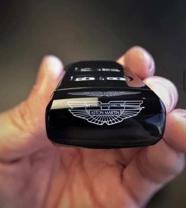 Sreberna Kemijska olovka sa potpisom aston martin koja se izvlaci iz sredine konzole sa serijskim brojem